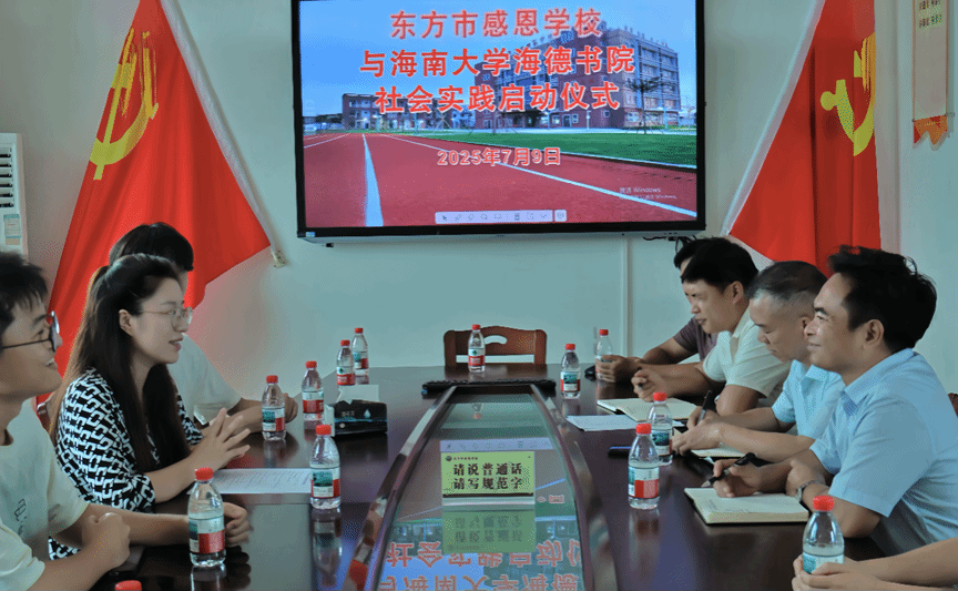7月9日下午,海南大学yl88858永利集团与东方市感恩学校社会实践启动仪式在东方市感恩学校隆重举行。此次启动仪式标志着两校合作共建的社会实践项目正式拉开帷幕。东方市感恩学校校长唐统俊,党支部书记、副校长吉志伟,行政办公室主任黄立鹏,工会主席兼总务室主任符透明,教导室主任秦燕,以及海南大学yl88858永利集团团委负责人芦怡睿和实践团成员参与此次活动。