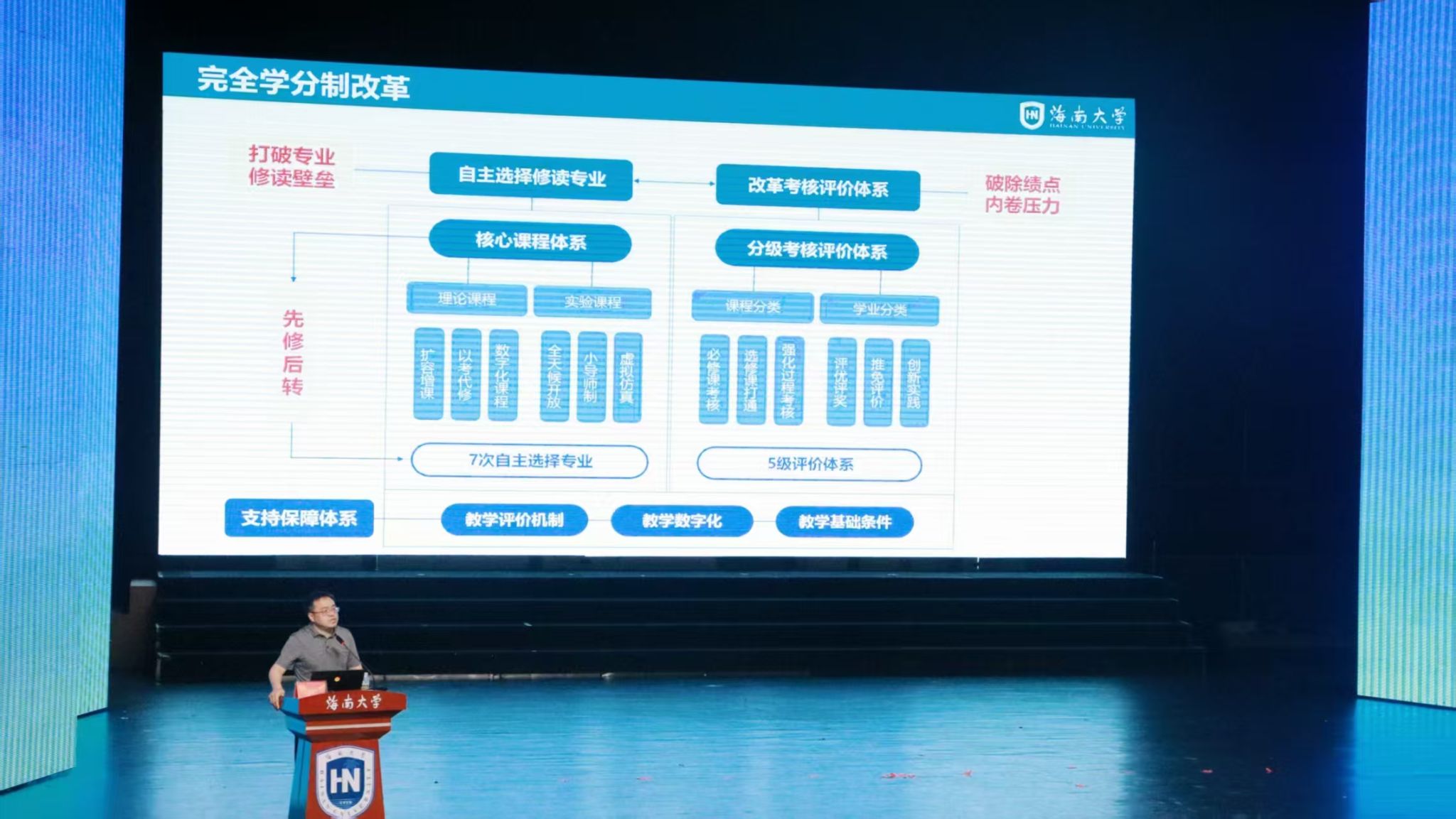 刘谦副校长以“为教育强国、教育强省建设贡献青春力量”为主题,围绕顺应海南自贸港发展潮流、满足学生个性化发展需求两大方向,并结合自身经历及见闻,从“学校发展总体情况、综合改革、教育数字化”三个方面,重点论述了如何为教育强国、教育强省建设贡献青春力量。他指出,要牢记习近平总书记“要支持海南大学创建世界一流学科”的殷切嘱托,以学校跨越式发展为基,全面推进教育科技人才一体改革,希望海大学子能熔铸“海大精神”,坚持不懈、敢为人先、奋勇向前,充分体现海大人的使命担当。