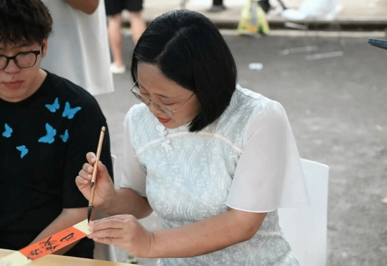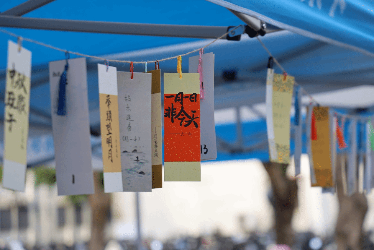 现场设置了猜灯谜互动环节。同学们积极参与,在悬挂的谜笺前驻足沉思,低声交流。