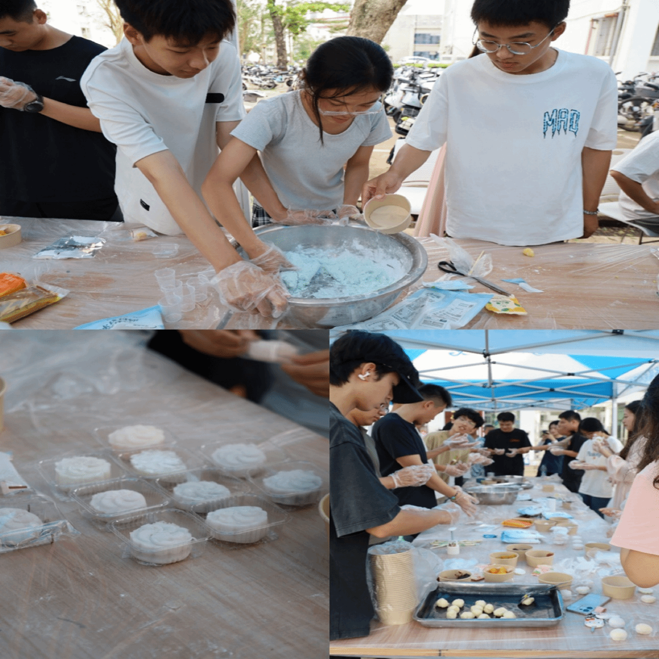 活动现场,同学们正亲手制作灯笼和月饼。几人一组,有的在搭建灯笼骨架,小心地糊上纸;有的则在和面、包馅,将月饼胚子压入模具,做出各种造型。