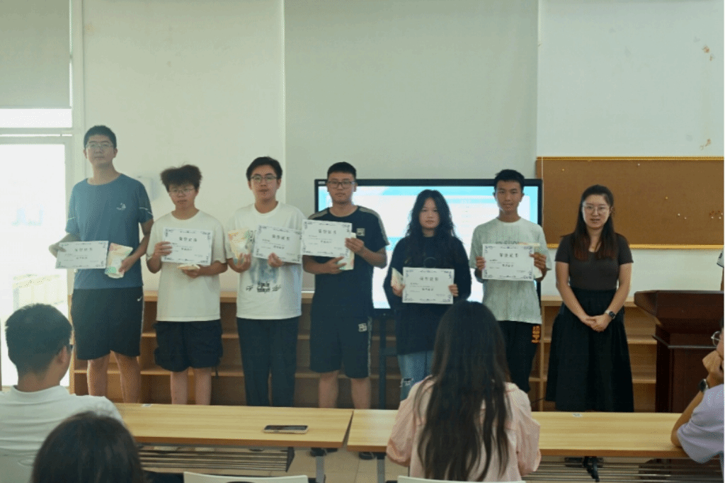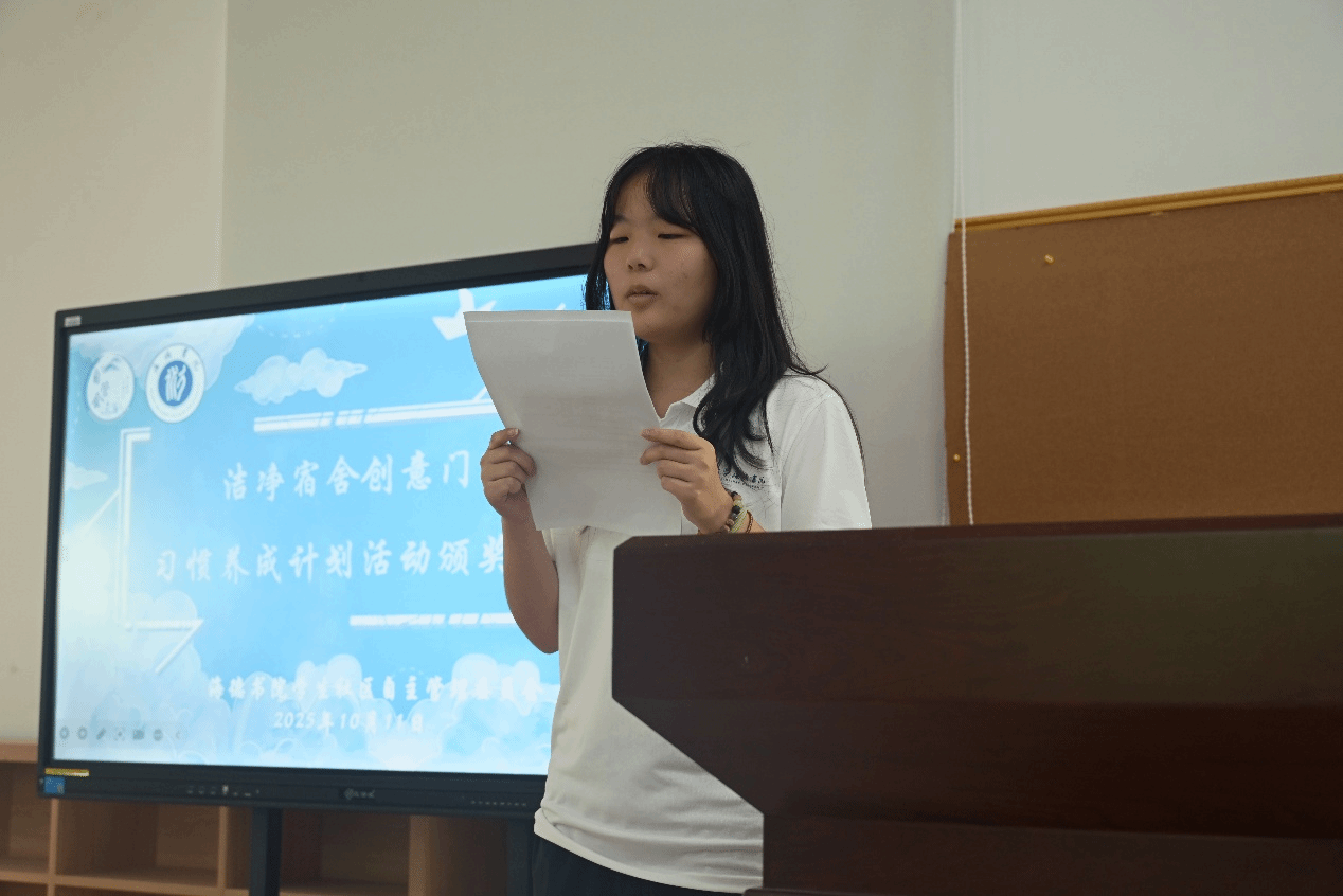 颁奖环节氛围热烈而温馨。芦怡睿老师余姜浩老师依次上台,为在“洁净宿舍创意门牌 —— 习惯养成计划” 活动中脱颖而出的宿舍颁奖。