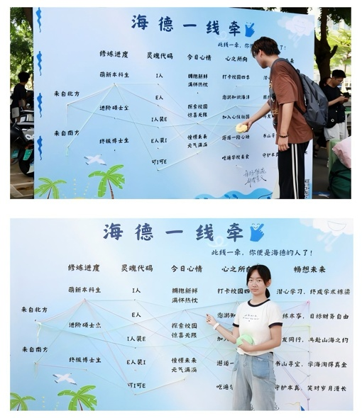 作为迎新特色环节,“海德一线牵”活动成为新生开启大学生活的“破冰钥匙”。新生们通过选择身份标签连线,不仅快速找到同频伙伴,更在互动中锚定大学时光的起点,解锁独属于海德人的仪式感。