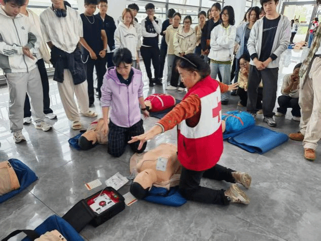 在实操练习环节,新生们分组使用模拟人进行实战演练,授课老师逐组巡视指导,及时纠正动作偏差,耐心解答大家提出的疑问。新生们专注投入、积极互动,在亲手实践中深化对急救技能的理解,有效提升了应对突发心脏骤停等紧急情况的处置能力。