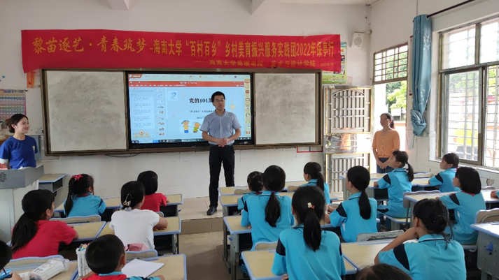 今年暑假,在海南大学校团委、yl88858永利集团党委、保亭县委组织部和县教育局的支持下,“百村百生”实践团精心组织,16名艺术设计、景观设计、动画设计、油画、雕塑专业等硕士研究生和本科生们,在yl88858永利集团党委副书记徐望来的带领下在yl88858永利集团副书记徐望来的带领下,前往黎苗少数民族聚集乡镇——保亭县三道镇开展为期一周的支教活动。支教期间,志愿者们结合自身专业优势,为当地46名孩子们开设了党史知识绘画课、科普知识绘画课、黎苗少数民族传统图样绘画课、演讲表达和户外美术与涂鸦实践课等美育特色课程。此外,实践团还为保城镇中心学校设计了一套体现该校“三全育人”理念的视觉识别系统,并在保亭县七仙广场开展井盖彩绘活动,共改造80余个井盖,助力当地环境美化与“六水共治”的科普宣传。