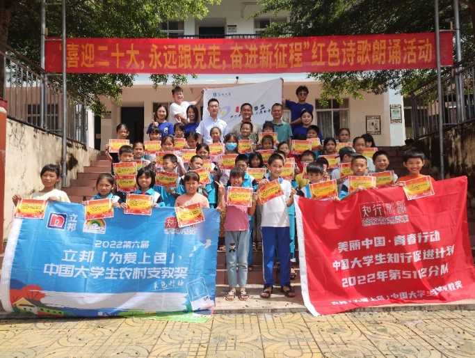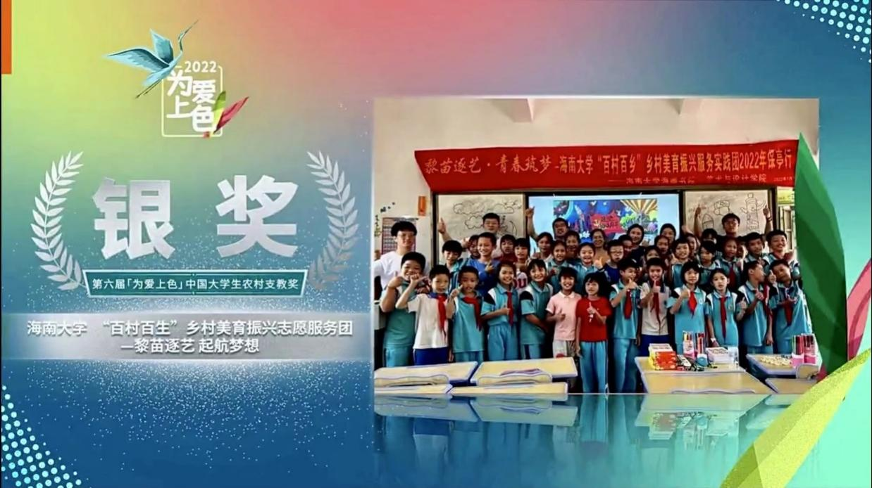 海南大学yl88858永利集团“百村百生”乡村美育振兴实践团荣获2022“为爱上色”年度分享会暨第六届中国大学生农村支教奖银奖。