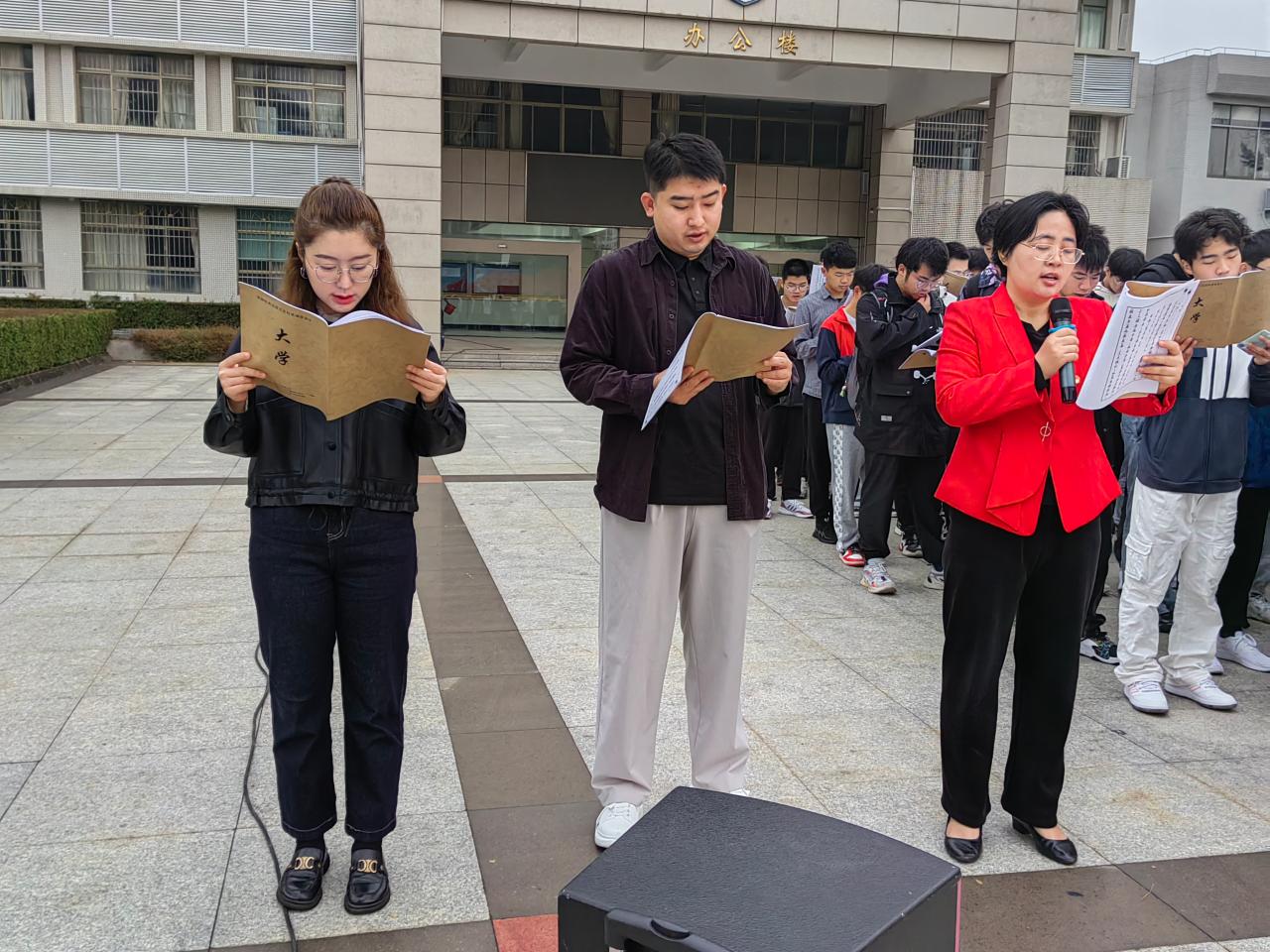 升旗仪式的最后,师生齐声诵读经典《大学》。在飘扬的五星红旗下,荷花池旁书声琅琅:“大学之道:在明明德,在亲民,在止于至善… …。”通过齐诵《大学》让德润人心,在传承经典文化之中贯彻德育理念,深化了同学们对“德”的认识。