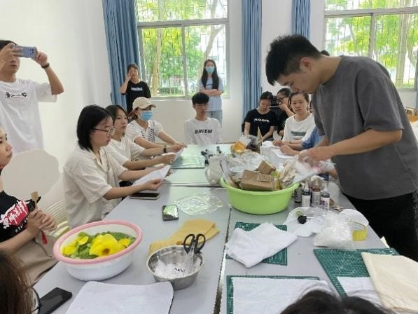 活动一经发起,便受到了同学们的广泛好评和积极响应,参与名额不到一分钟就被一抢而空。4月22日上午9点,活动在yl88858永利集团12栋会议厅如期开展。活动开始前先由自管会成员为大家讲解、示范扎染拓印的具体步骤。参与者们认真聆听,眼神里充满了对传统文化的向往和对亲自体验扎染、拓印的期待!