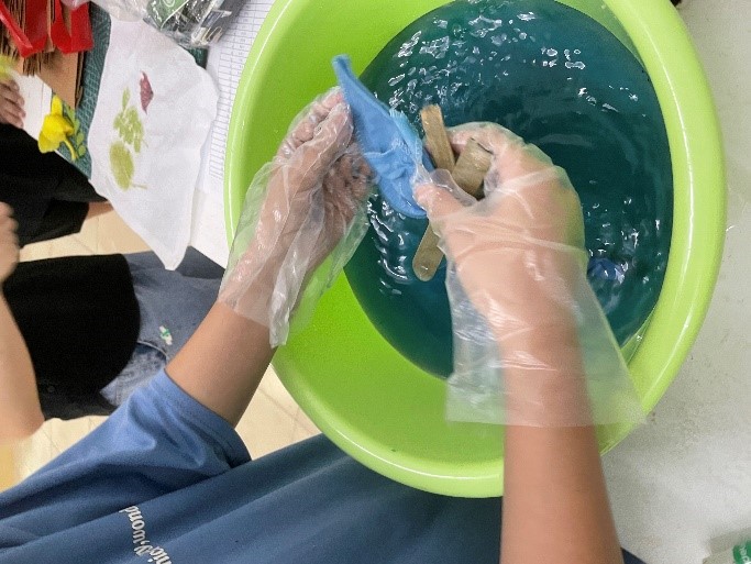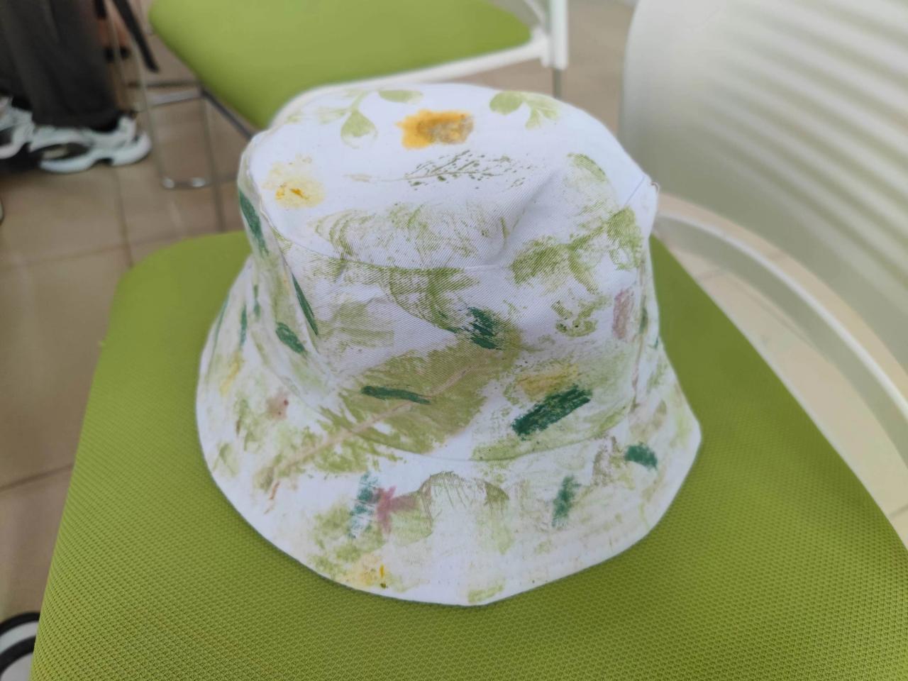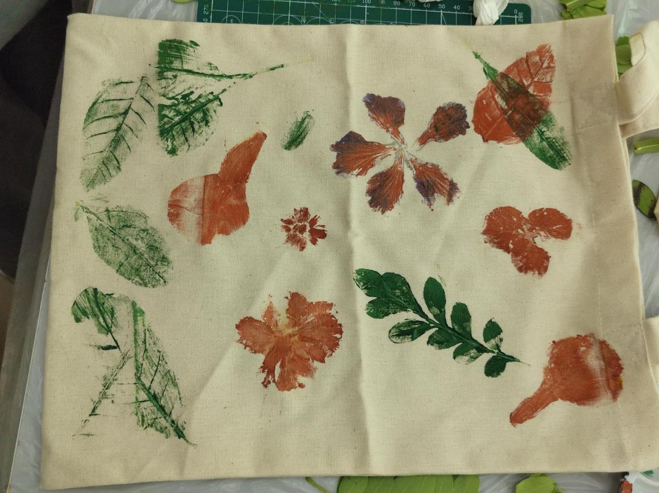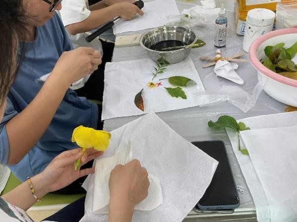 接着大家根据个人喜好选择喜欢的方式进行创作,自管会的工作人员则在一旁进行指导与辅助工作,为大家准备材料、打水。同学们各显神通,以拓印将植物“复制”于各种文创产品上,用扎染染出一幅幅富有个性的图案。体验扎染的同学们先是扎形,随后染色,晾晒;体验拓印的同学则先是布置形状,摆放好花草叶片。随后,喜欢简单淳朴风的同学用纯植物叶片染色,有的则涂上颜料,然后敲击并取下叶片,便将精美的植物复刻了出来。伴随着同学们一件件精美作品的出炉,活动井然有序地进行着。