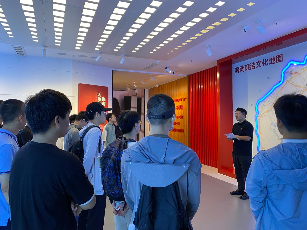 在海南廉洁文化地图下,第五党支部书记宫杜天宇、第四党支部书记杨永强带领参与此次活动的全体同学,领学习近平总书记关于党的自我革命战略思想。“自我革命精神是党永葆青春活力的强大支撑。”回顾党的百年奋斗历程,无论我们党面临怎样的形势变化和严峻挑战,自我革命精神始终是中国共产党的鲜明品格和最大优势,是党不断提升执政能力的关键。
