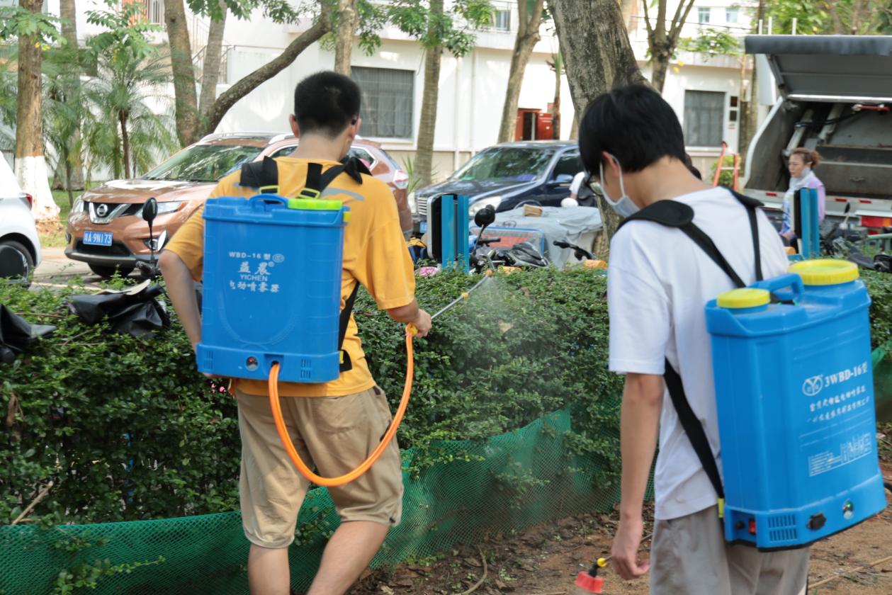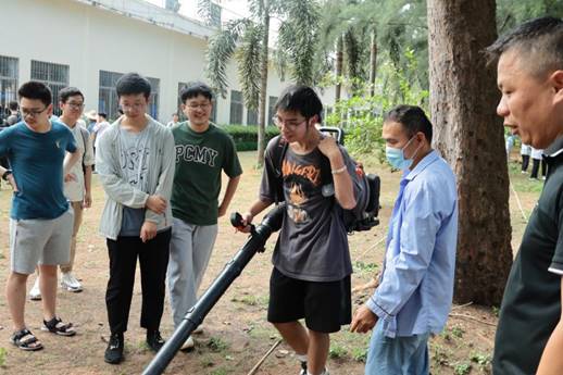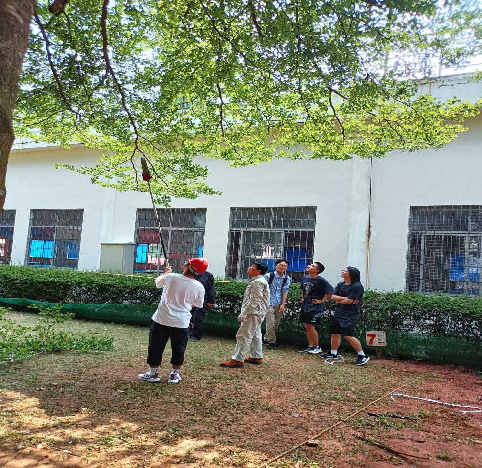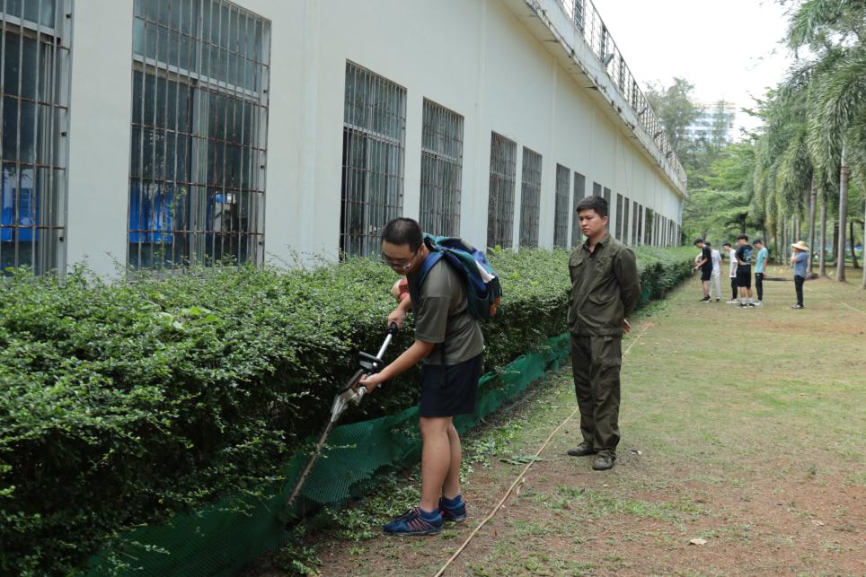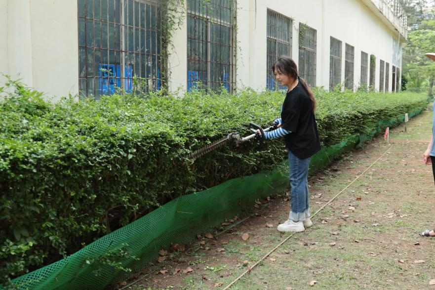 揭牌仪式后,同学们在工作人员的引领下,合力开展劳动实践活动。男生对各类机械工具表现出浓厚的兴趣,耐心听工作人员讲解如何正确开关仪器设备,如何去将一个树丛修剪的整洁美观。女生也几人一队,相互协作,很快就清理了一大片落叶杂草,赢得了工作人员及老师的夸赞。在工作人员的帮助下,同学们有序的进行草坪修剪、绿篱修剪、清理垂枝枯枝枯果、病虫害防治、扒草坪、除杂草等,现场呈现出一派热火朝天的劳动景象。