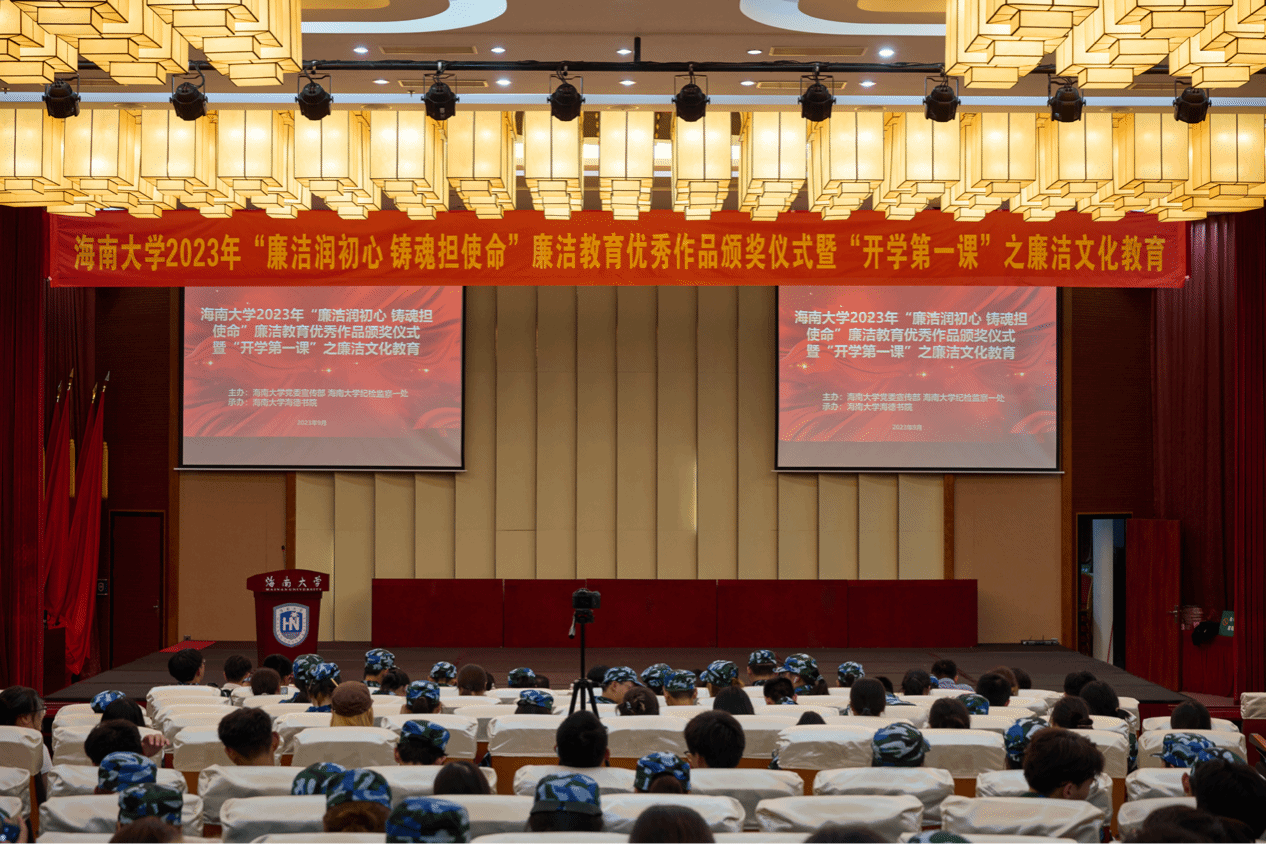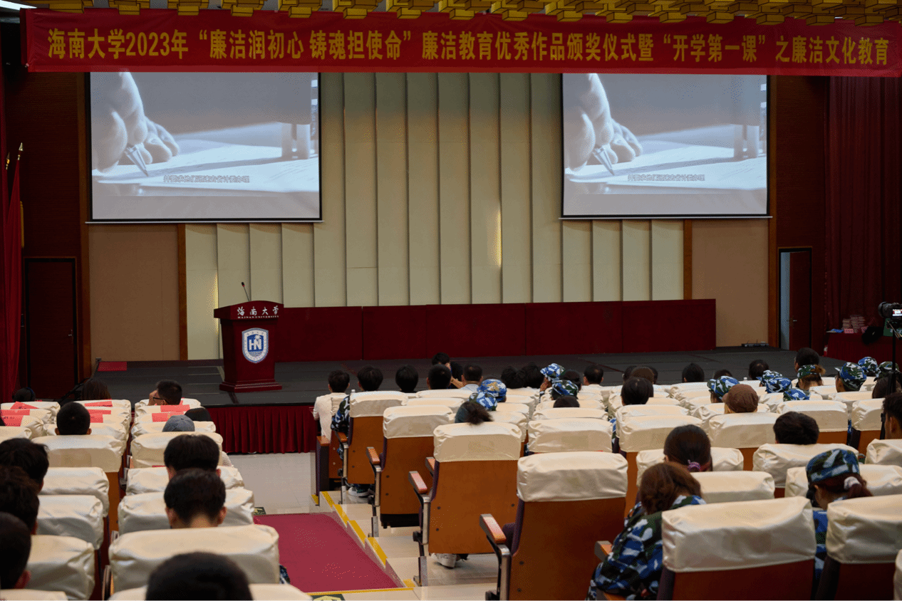 为引导全校师生进一步夯实清正廉洁思想根基、厚植廉洁奉公文化基础、培养廉洁自律道德操守、弘扬崇廉拒腐社会风尚,不断增强廉洁治校、廉洁从教、廉洁育人、廉洁修身意识,营造积极向上、崇尚清廉、风清气正的校园文化氛围。9月18日晚,由海南大学党委宣传部、海南大学纪检监察一处主办,海南大学yl88858永利集团承办的“廉洁润初心,铸魂担使命”廉洁教育优秀作品颁奖暨海南大学yl88858永利集团“开学第一课”之廉洁文化教育在社科楼二楼报告厅顺利举行。海南大学党委常委陈明宝,海南大学纪委副书记、纪检监察一处处长陈琛,纪检监察二处处长欧大雷,学生工作部(学生工作处、人民武装部)部(处)长陈秀妍,法学院(纪检监察学院)党委书记蒙秋妍,党委宣传部副部长黎雨苗,网络空间安全学院(密码学院)副院长周晓谊,海南大学天工书院党委书记易振,海南大学后勤保障部(总务后勤处)兼职党建组织员符万祺,海南大学yl88858永利集团党委书记韩胜丁以及本次廉洁教育优秀作品获奖师生代表和yl88858永利集团2023级本科新生共同参加了此活动。活动由yl88858永利集团辅导员芦怡睿老师主持。