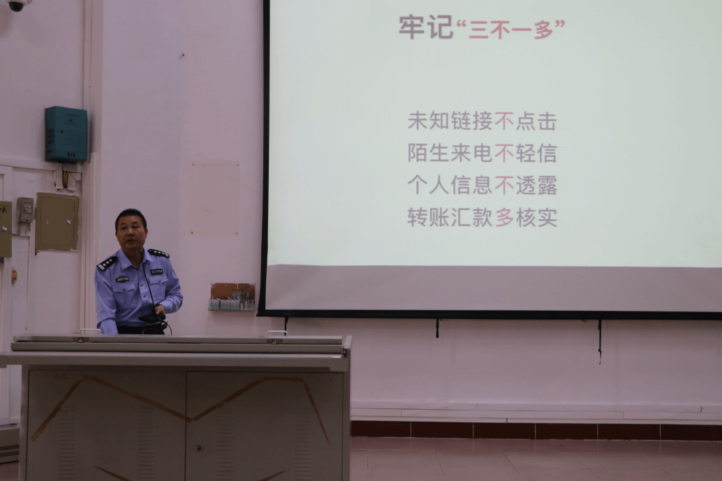 当谈及“电信网络诈骗”,何警官带领同学们了解了其基本定义、特点和危害,并结合自身多年反诈经验和身边具体案例,为同学们梳理总结了包括“杀猪盘”“杀鸟盘”“杀鱼盘”等在内的十种常见诈骗方式,同时通过公开诈骗人员的笔记、播放反诈视频等方式来告知同学们要牢记“三不一多”,即“未知链接不点击、陌生来电不轻信、个人信息不透露、转账汇款多核实”。