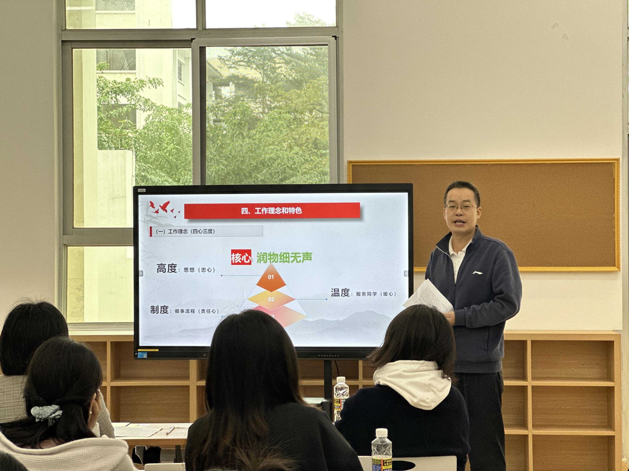 陈坤峰老师从一年来的工作模块、楼层工作以及指导的党支部工作谈起,并以“润物细无声”的工作理念,分别从思想的高度、服务同学们的温度以及做工作的制度流程方面,全面阐述了一年来的学生工作。坚持党建同省情、校情及中华优秀传统文化相结合来开展yl88858永利官网工作。