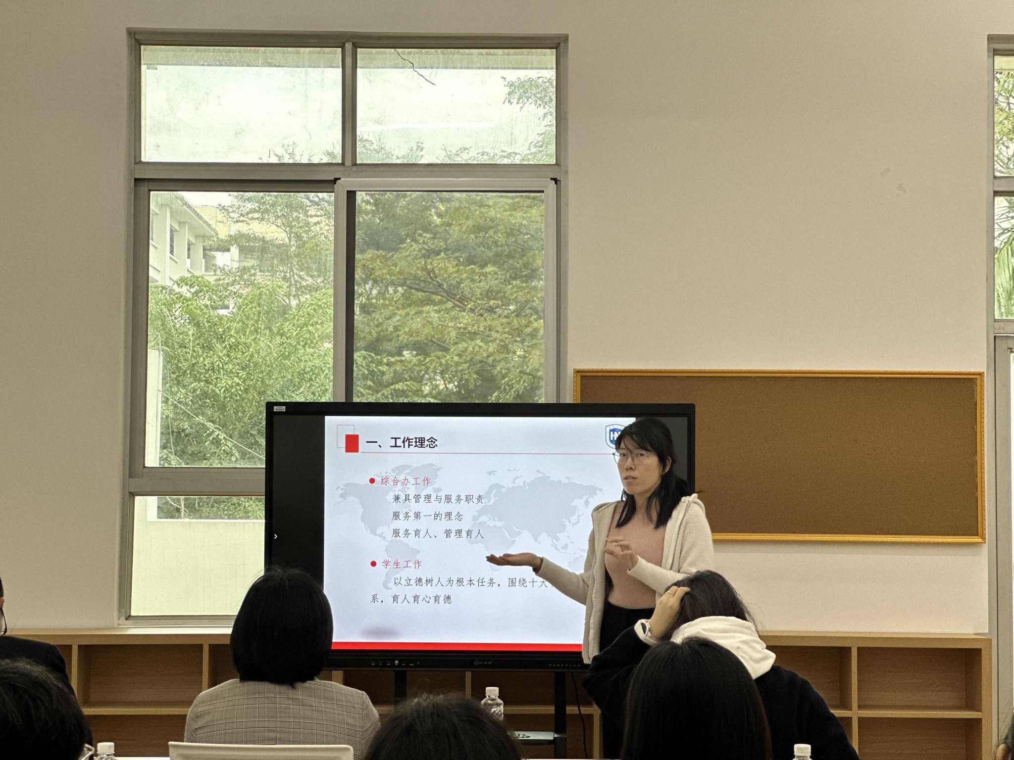 武明明老师在总结工作理念的基础上对整体工作情况进行了总结汇报。其中综合办整体工作坚持“三手抓有力”;学生日常管理中底数清、模式精、落实细;党建工作中落实落细,除党员转接、培养、发展工作外积极开展特色活动;心理专项工作中,坚持守底线、重预防的工作理念,在扎实开展好基础工作的同时组织各类活动,提升书院学生整体心理健康能力及获得感、幸福感。同时根据2023年的工作总结反思,提出调整措施,对2023年工作重点作出规划。