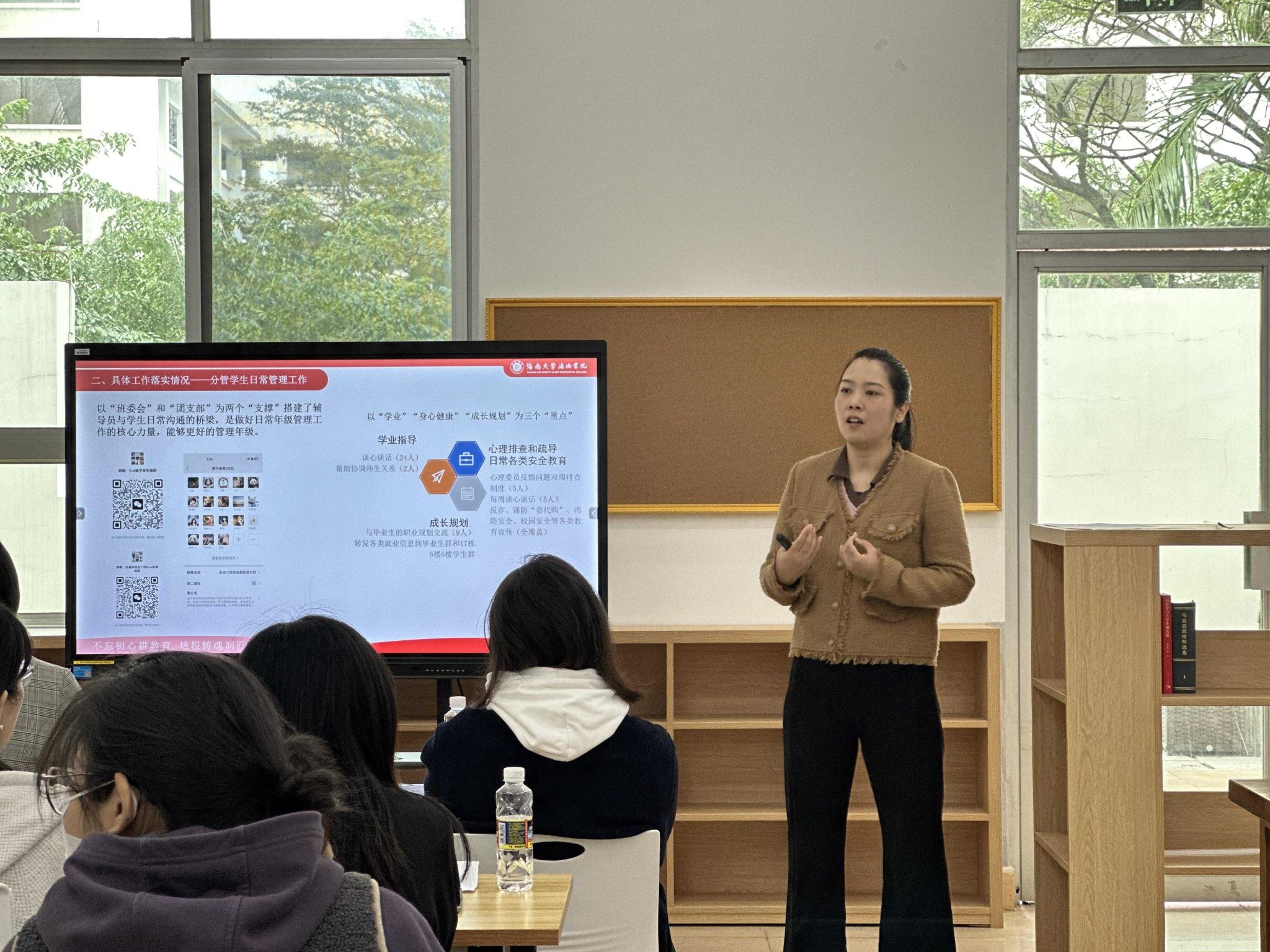 周婧老师介绍了过去半年所带学生的日常管理、就业创业、研究生会以及党建工作。通过建立班长微信群,楼层信息群,支部,支委等微信群体系全方位联系和了解学生,以研究生会为抓手结合书院的育人理念开展智育、德育、美育、体育、劳育,五育并举工作。