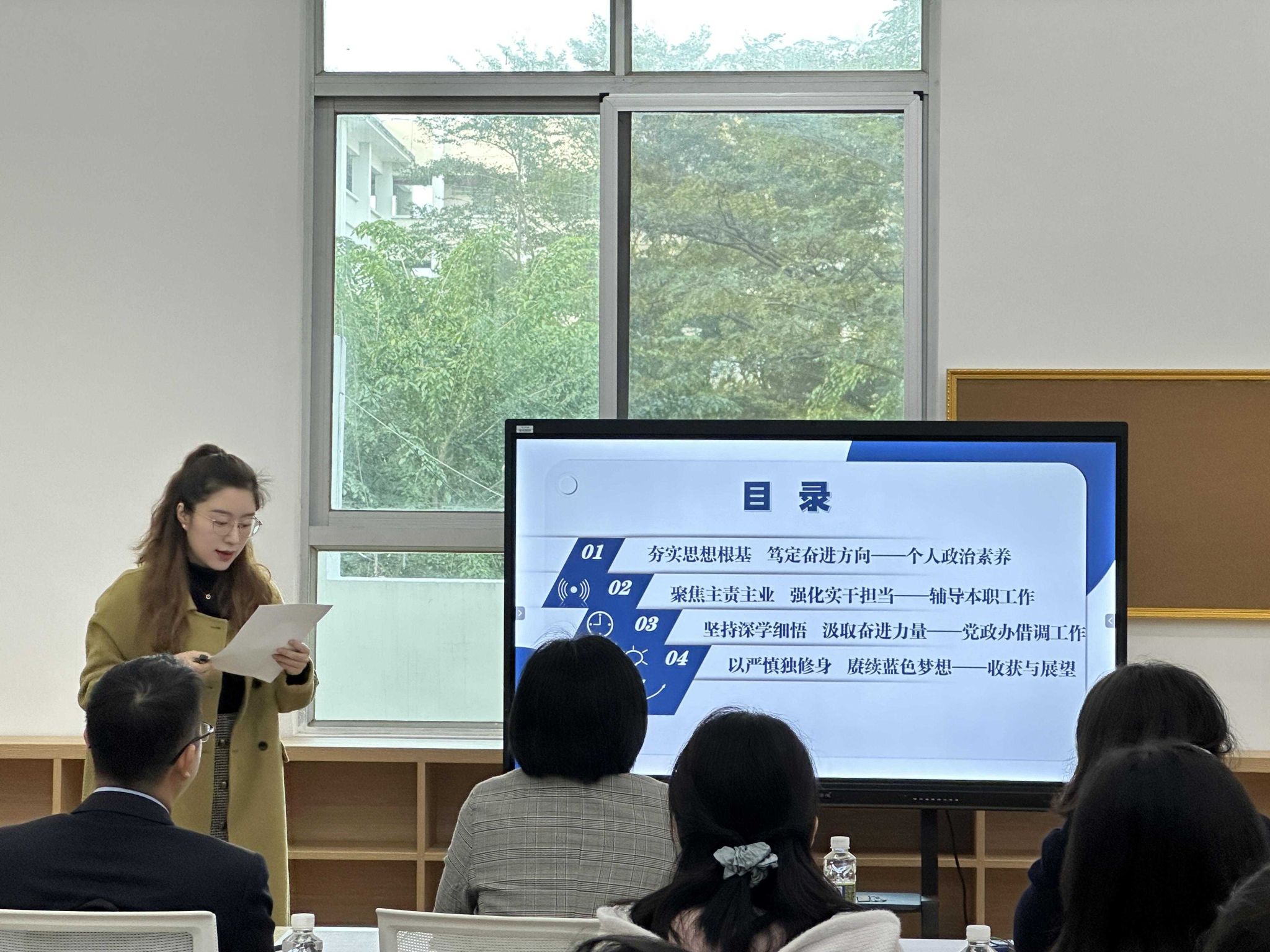 芦怡睿老师围绕个人政治素养,辅导员本职工作、党政办借调期间工作以及收获等方面汇报本年度的工作进度与成果。同时提出了下一年度的工作规划和努力做一位“全能型”辅导员的决心。