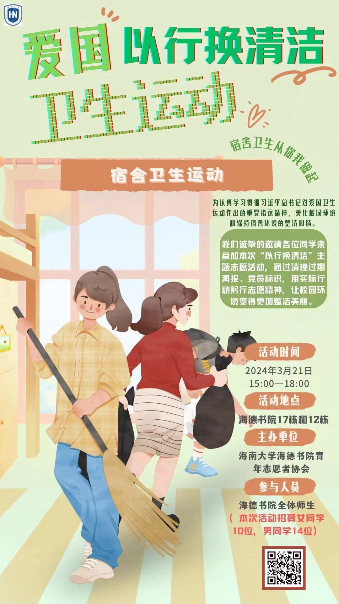 为学习贯彻习近平总书记对爱国卫生运动作出的重要指示,美化校园环境和保持宿舍环境的整洁和谐,yl88858永利集团于2024年3月21日开展了一系列“爱国卫生运动”主题活动。