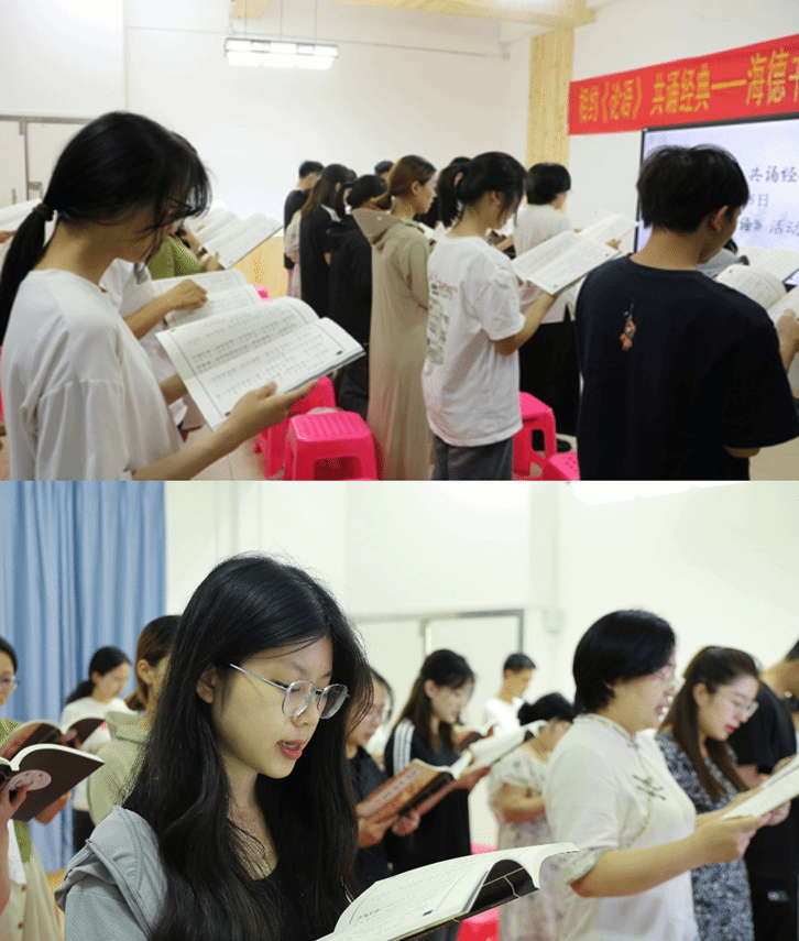 活动最后,师生怀着崇敬的心情,齐声诵读《论语》,用字字深情,句句婉转的诵读演绎了一场与经典跨越时空的对话,朗朗诵读声久久回荡,大家在《论语》诵读中走进经典,从中浸润涵养,立心立命。