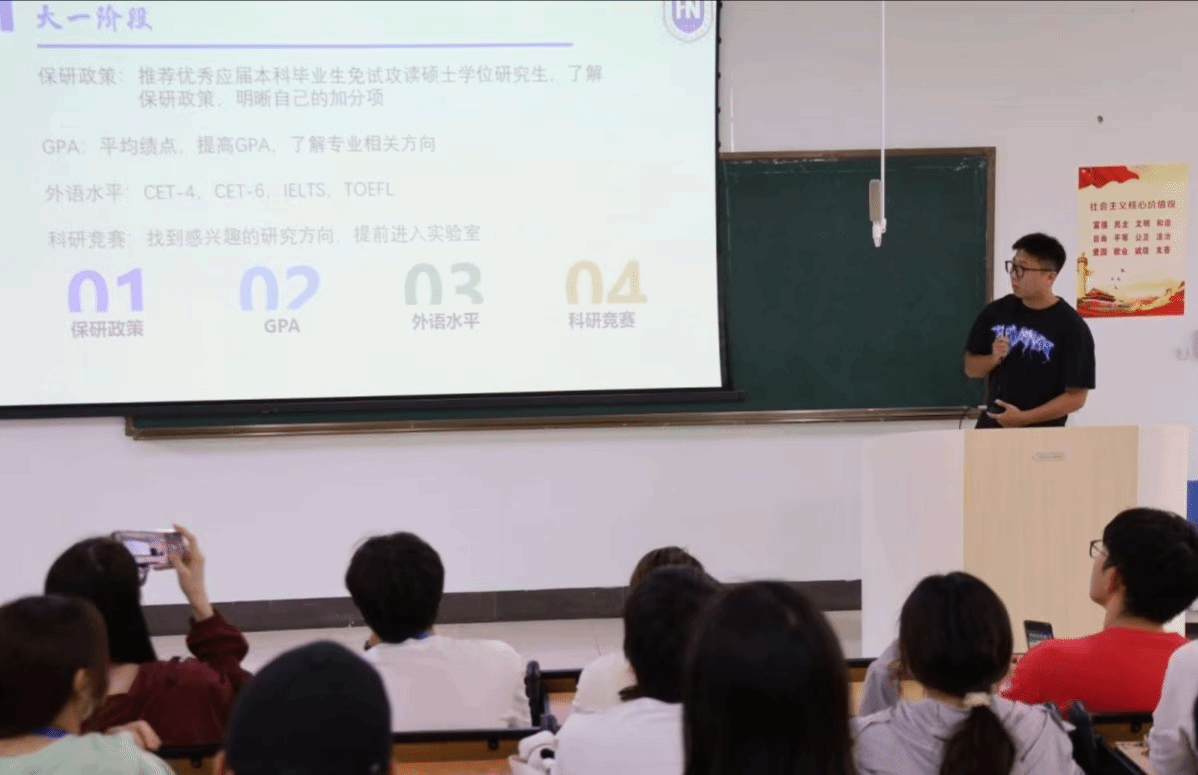 随后作分享的是刘智元学长(已推免至武汉大学生命科学学院)。他以流程图的形式,为同学们讲述了大学各个阶段应做的事情,并强调了绩点、科研竞赛、外语水平的重要性。