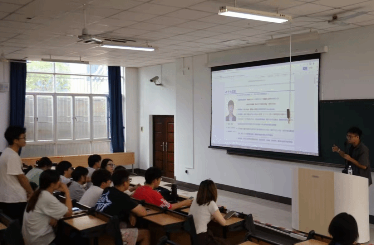 最后作分享的是赵洪豪学长(已考研上岸中国海洋大学)。他围绕思想、学习、生活、工作四个部分详细介绍了升学路径的抉择以及备考方法,最后勉励同学们“青矜之志,履行致远”。