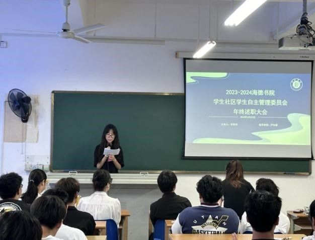 会议伊始,自管会主席团秘书长李鲜鲜进行述职汇报。她总结回顾了自管会这一学年所取得的成果,并对未来工作提出了展望。
