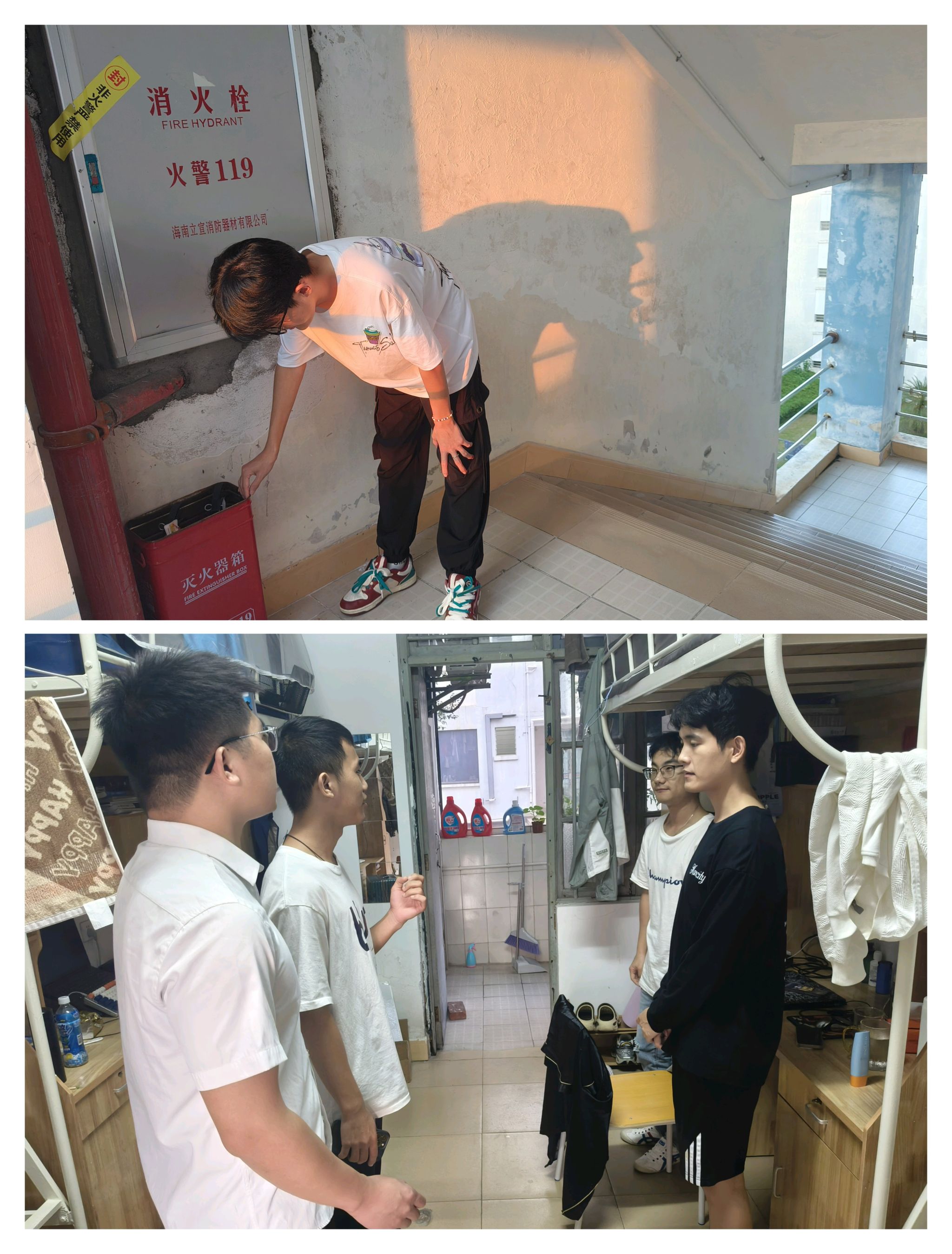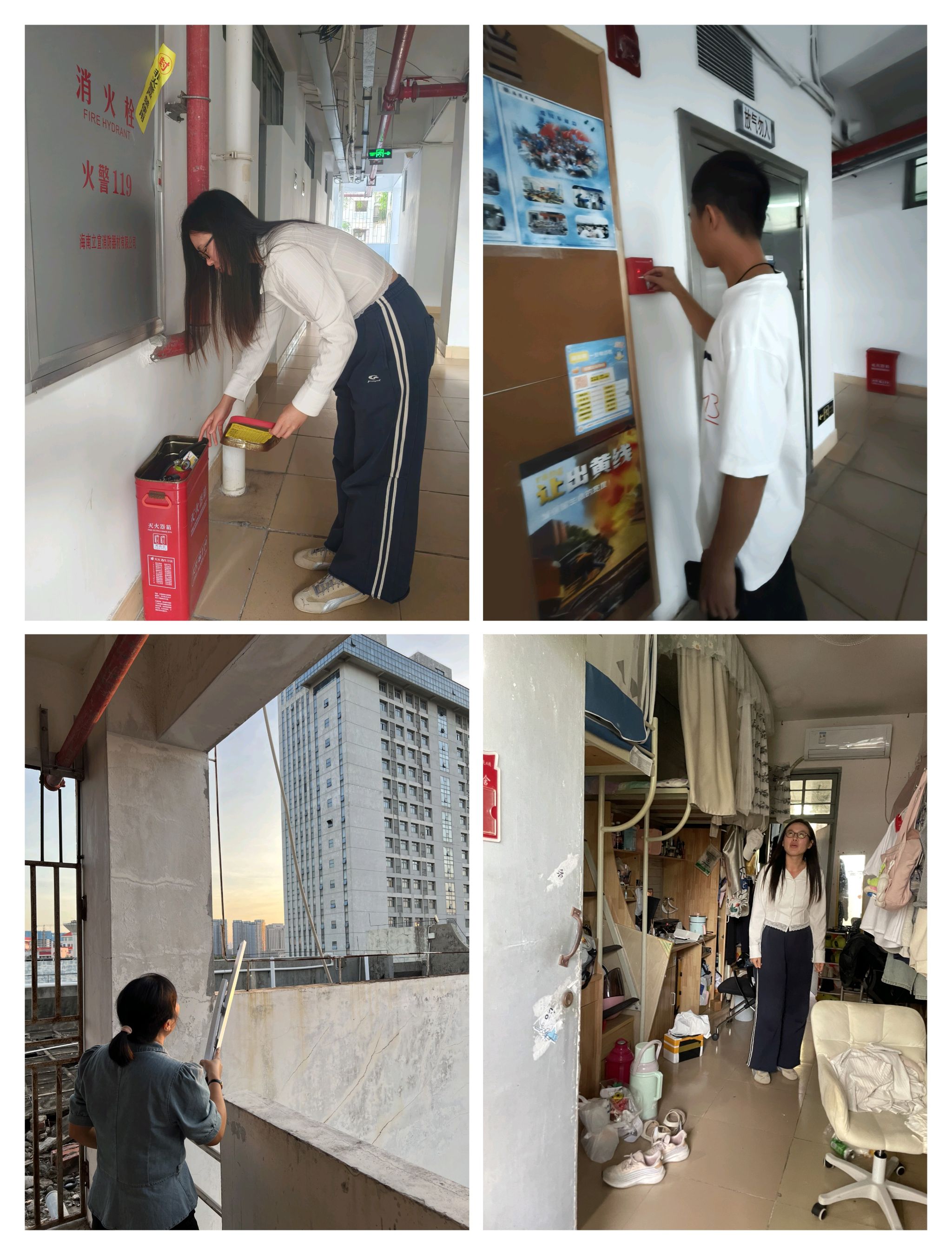 辅导员老师们带领学生干部深入到各楼层、各学生宿舍,排查安全隐患。重点对消防器材、消防通道、安全出口标识、应急照明灯等逐一检查,做到全覆盖、不留死角,并将安全隐患详细记录及时报后勤部门维修;同时,提醒同学们台风期间的注意事项,提醒大家提高安全意识,非必要不外出,及时清理阳台和楼道的堆积物,做好防风防水措施。如遇突发情况,第一时间向书院报告。