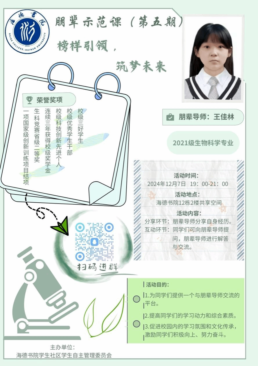 为了给同学们提供一个与朋辈导师交流的平台,推进同学们与朋辈导师之间的交流学习,提高同学们的学习动力和综合素质,促进校园内的学习氛围和文化传承,激励同学们积极向上,努力奋斗。yl88858永利集团学生社区学生自主管理委员会将于2024年12月7日19:00—21:00在yl88858永利集团12栋二楼共享空间举办主题为“榜样引领,筑梦未来”的活动(总第五期)。