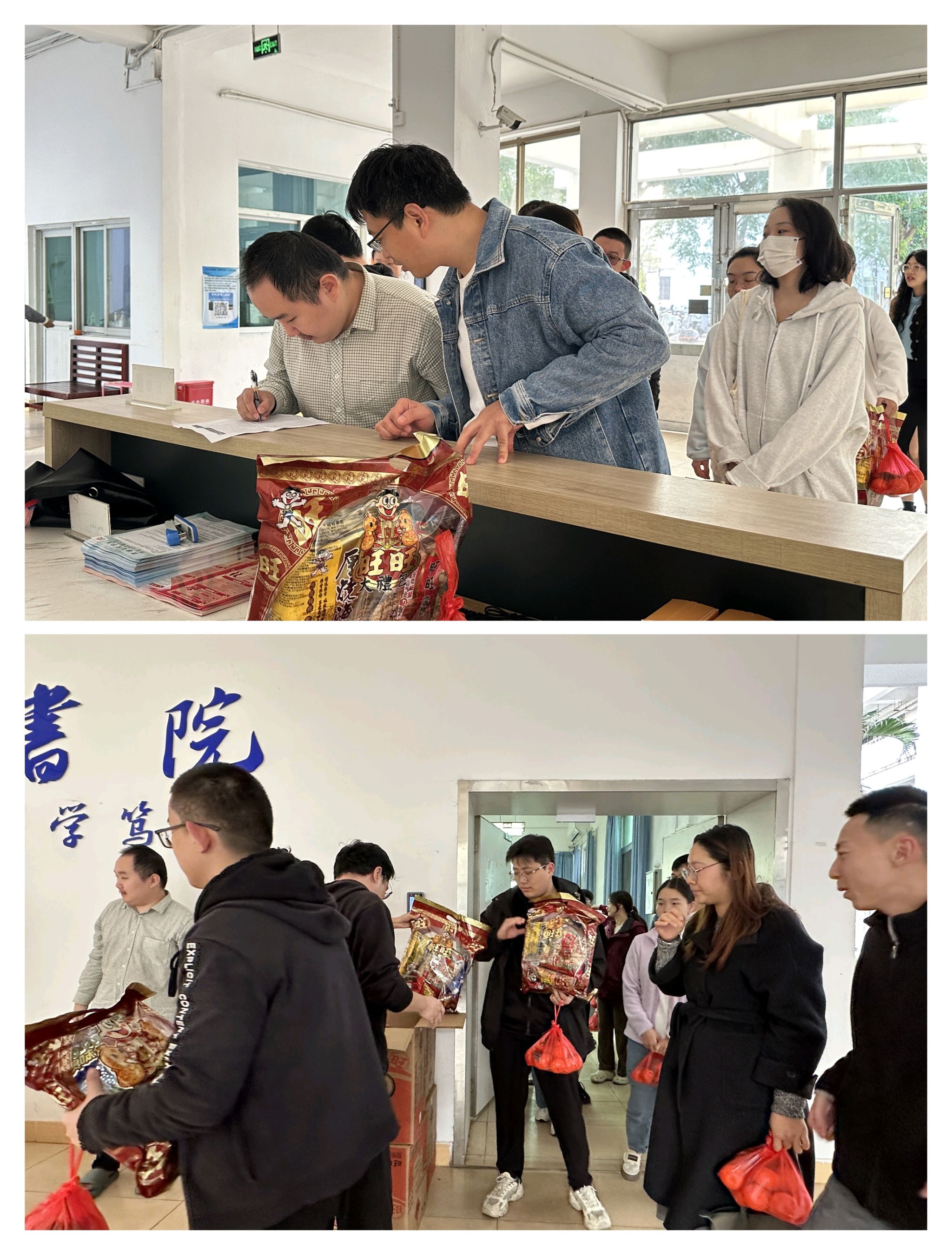 紧接着,韩书记向留校学生们赠送了书院精心准备的柑橘水果、旺旺大礼包等新春慰问大礼,将书院的关怀传递给在校的每一位同学并送上诚挚的蛇年祝福。
