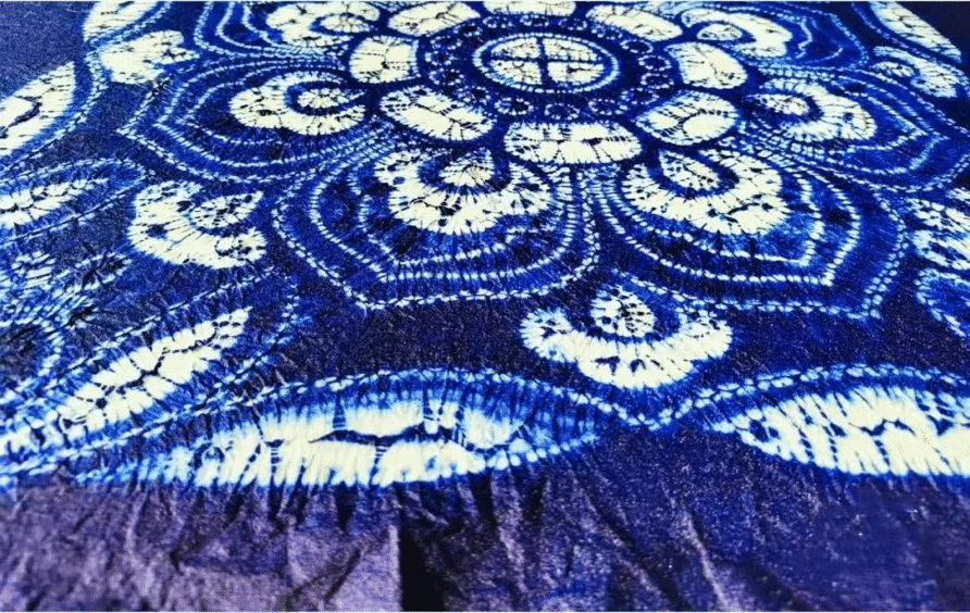 “扎染”,又称绞缬,在我国有着悠久的历史,是一种采用结扎染色的古老工艺,也是我国传统的手工染色技术之一。它依据一定的图案将织物进行结扎,然后将其放入由植物(比如板蓝根、茜草、苏木、栀子等)熬成的汁水中反复浸泡染制,等到染透后,再解去缝扎线脚、放入清水中漂洗,布料上就会留下所缝扎的清晰图案。