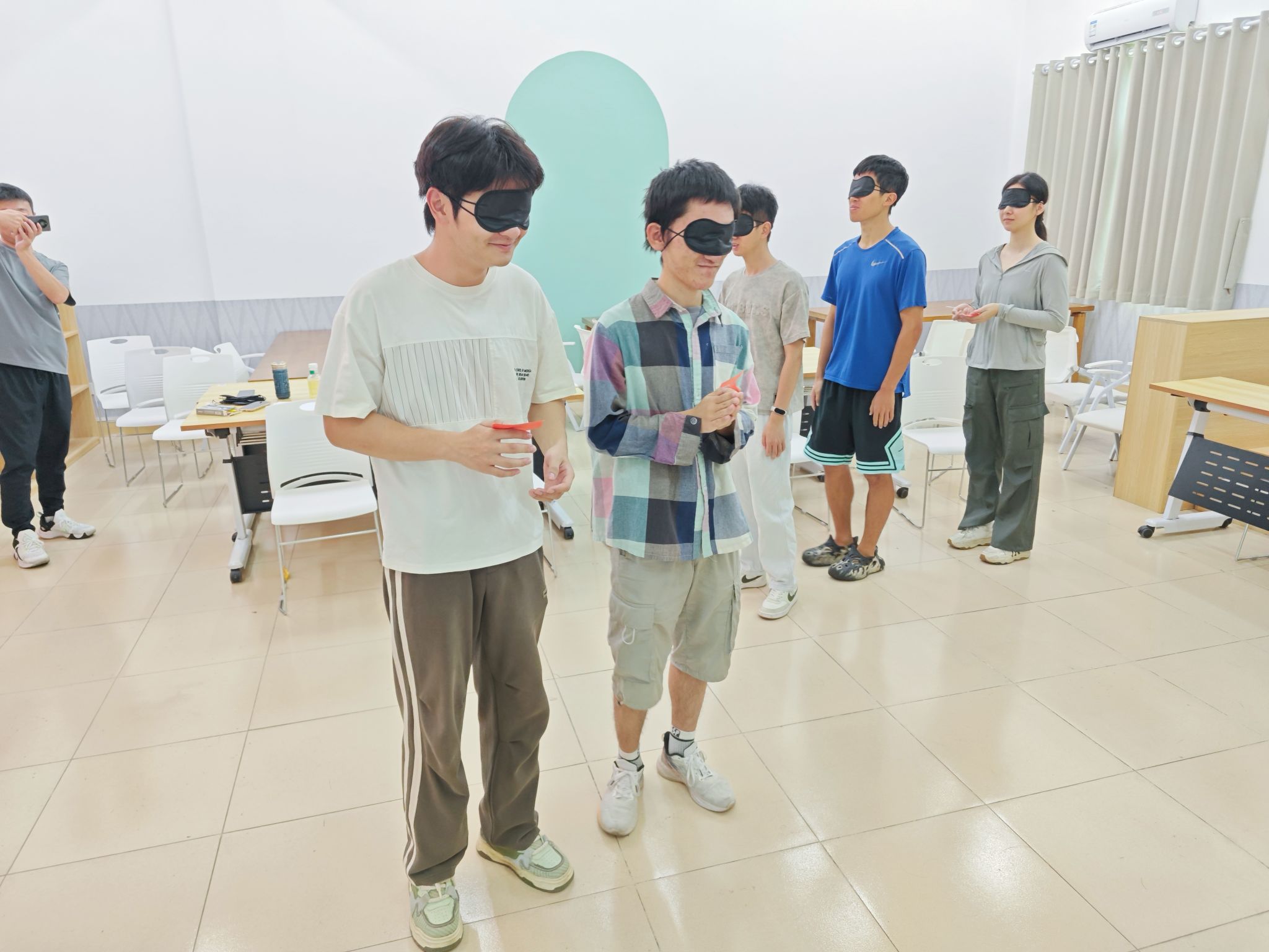 活动伊始,通过“盲哑人排队”的热身游戏,同学们迅速进入状态。两队成员分别抽取数字号码,戴上眼罩,在不能说话的情况下,按照数字顺序进行排队。经过激烈的比拼,用时较少的队伍获得了胜利,现场气氛热烈。