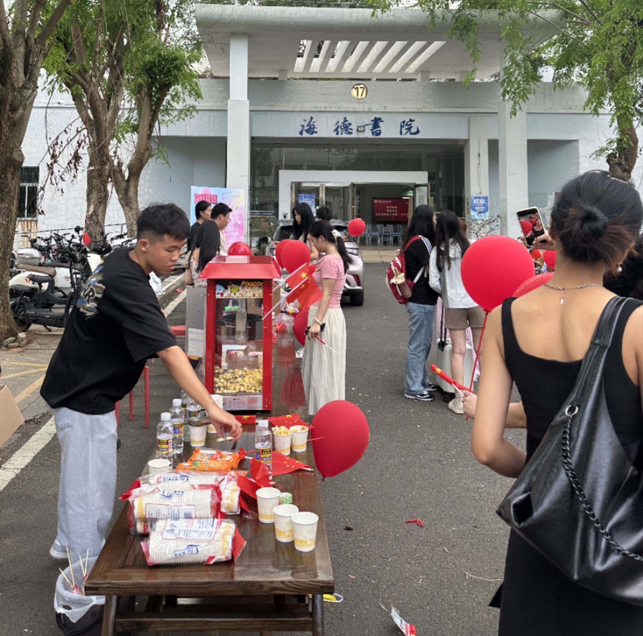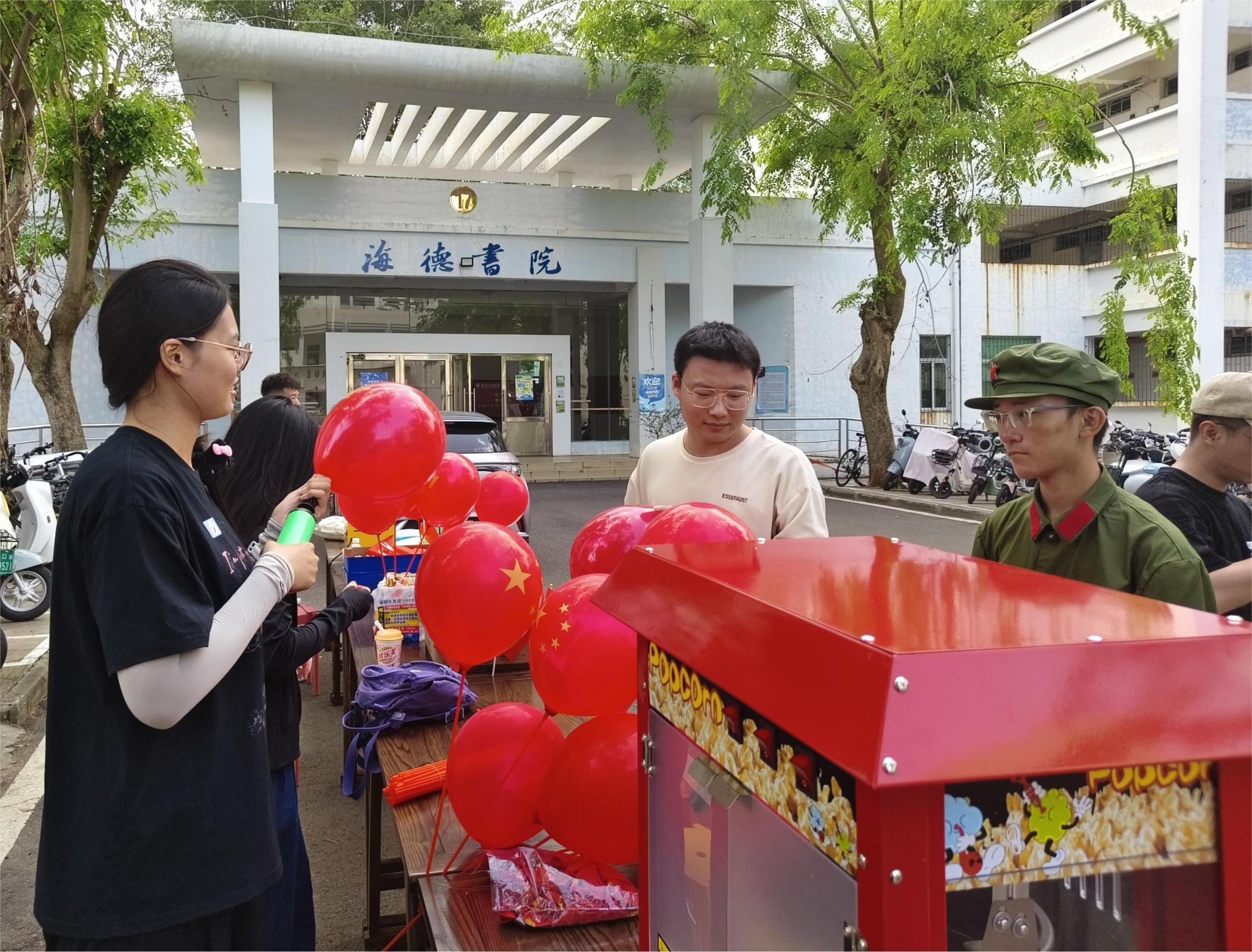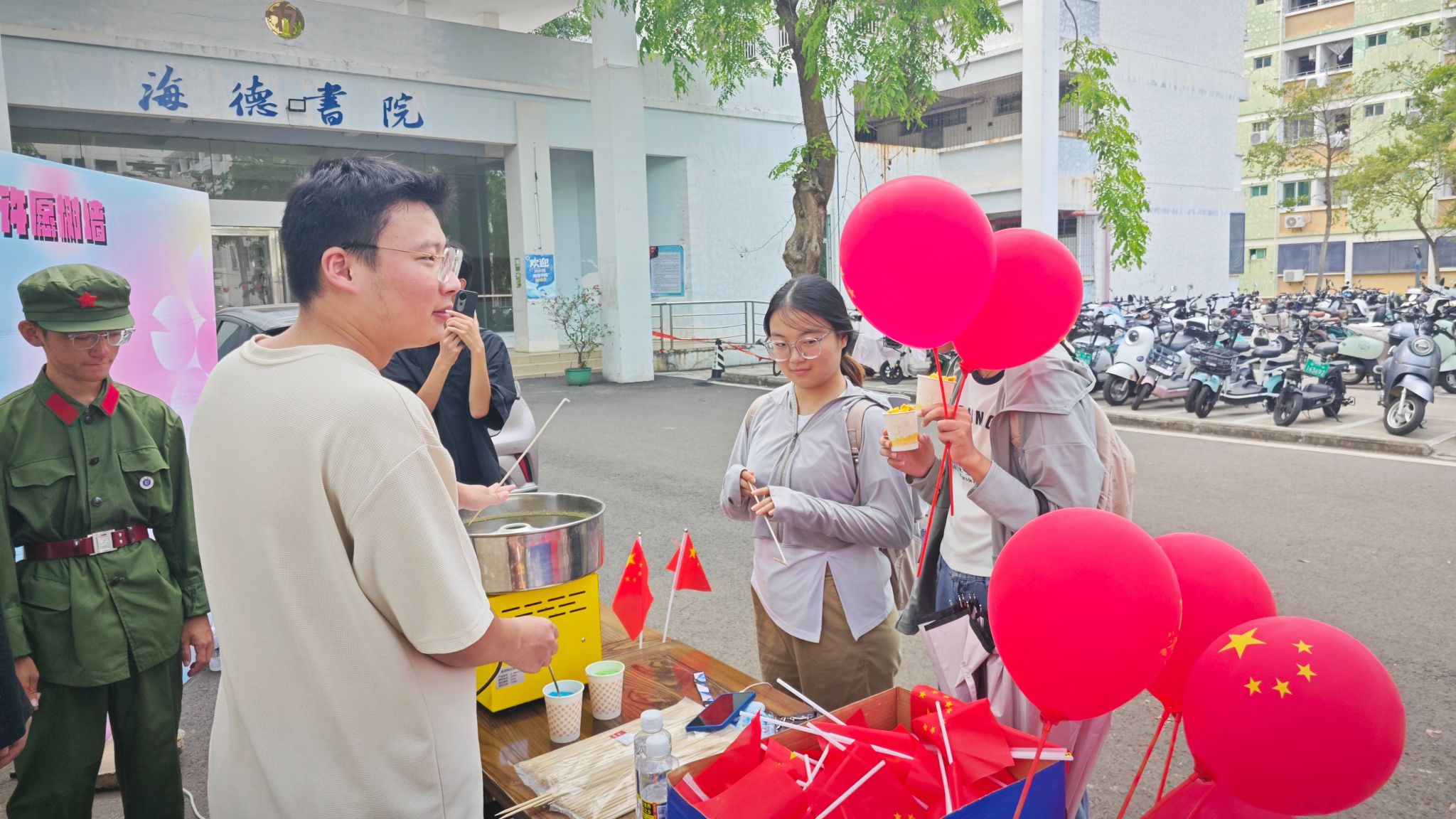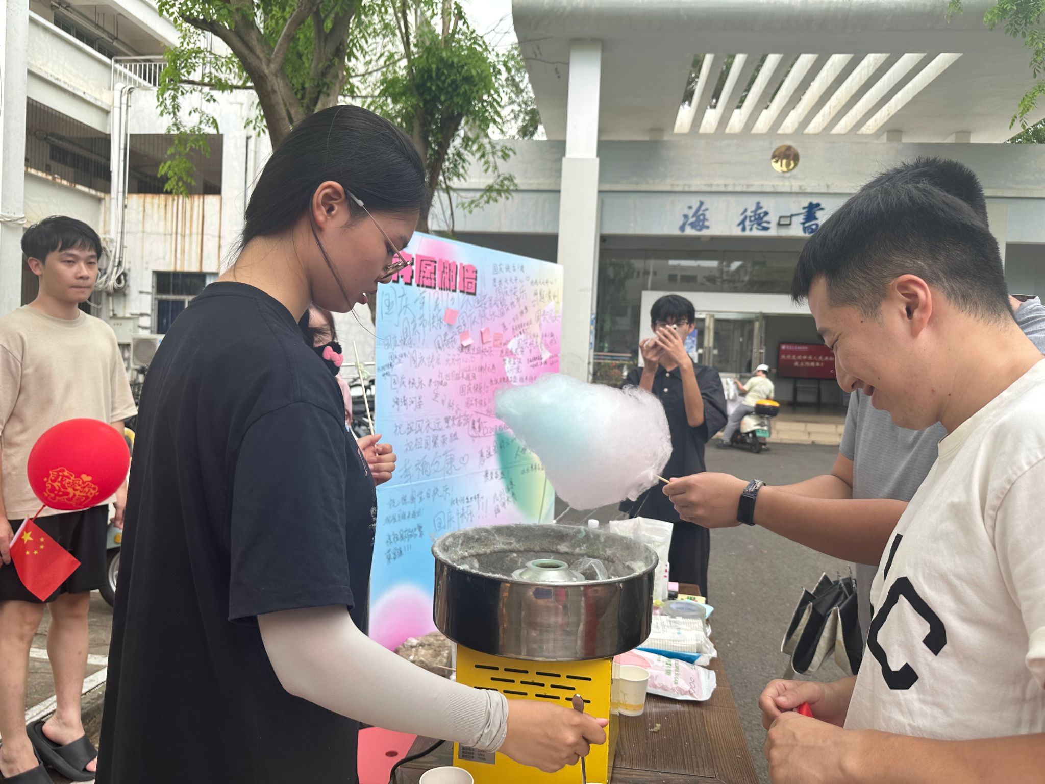 许愿树墙前,师生们写下对祖国祝福和深情告白,表达对未来的美好憧憬;爆米花机边,同学们亲眼目睹一颗颗玉米粒的“美妙之旅”,舌尖上的“爆米花”给大家带来了快乐和满足感;亲手制作一朵独一无二的棉花糖,又让大家感受到指尖传递的甜蜜与幸福,让心灵得到最纯粹的愉悦和放松。