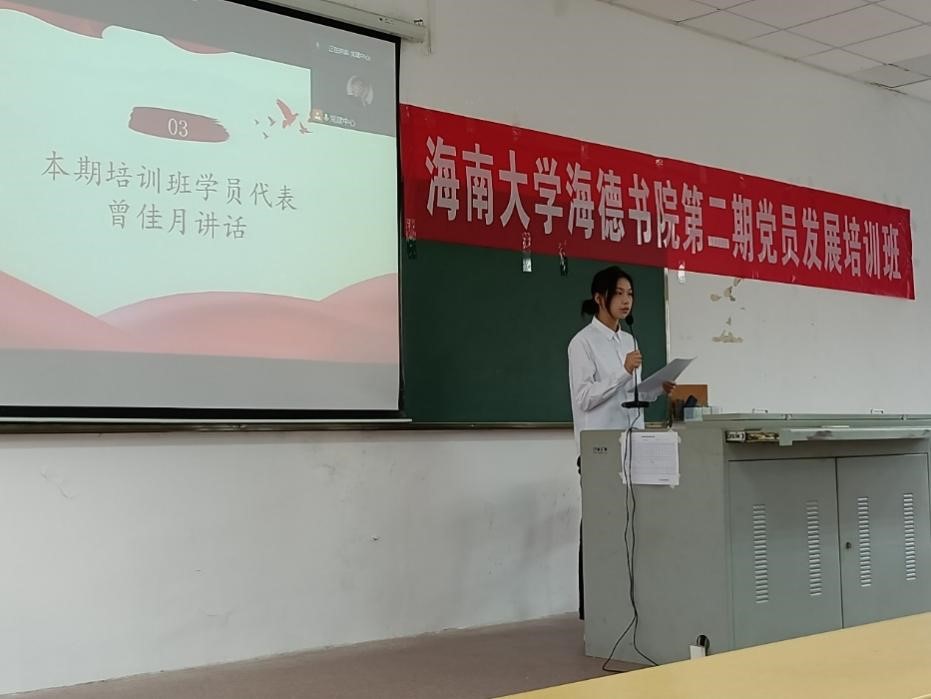 随后是本期培训班学员曾佳月讲话。曾佳月同志认为党员需要树立自觉性,强化理论学习;要培养良好的学习习惯,提高学习效率;更要提高主动性,强化实践锻炼,在实际行动中检验自己。她表示要以实际行动争取入党,在行动中展现自我青春,不断提高自身能力。“路漫漫其修远兮,吾将上下而求索”,她号召同学们要明确前进目标,积极学习,扎实工作,努力提升业务水平,牢牢掌握为人民服务的本领,要坚持为人民服务,共同绽放属于中国青年的绚丽之花。