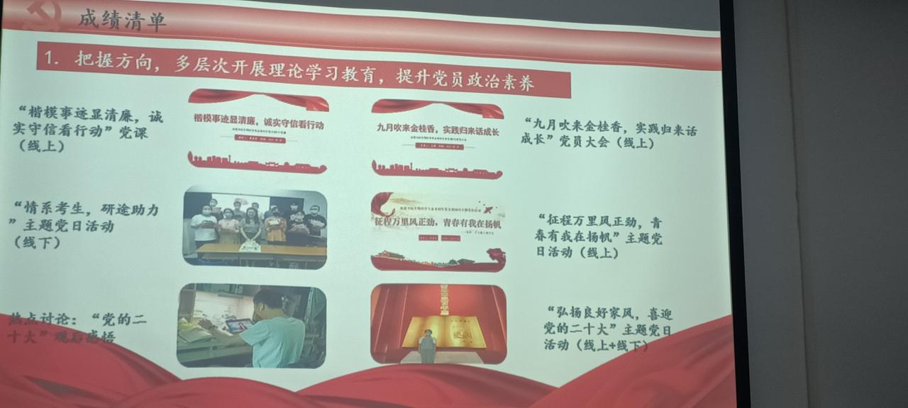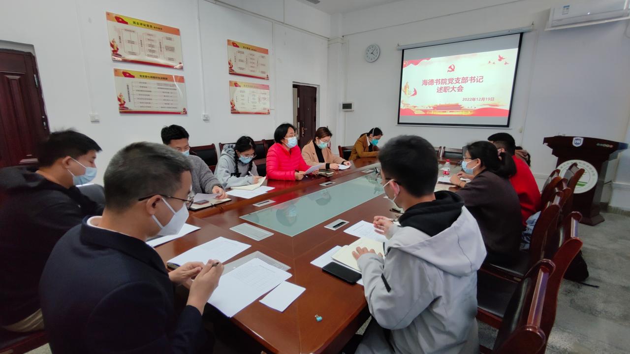 在书记述职环节,9位党支部书记紧紧围绕支部的基本情况、成绩清单、问题清单、任务清单,就党支部2022年度理论学习、“三会一课”制度执行情况、组织生活、支部主题党日活动、队伍建设等方面进行述职,分析存在不足以及努力方向向书院党委进行了详细汇报。