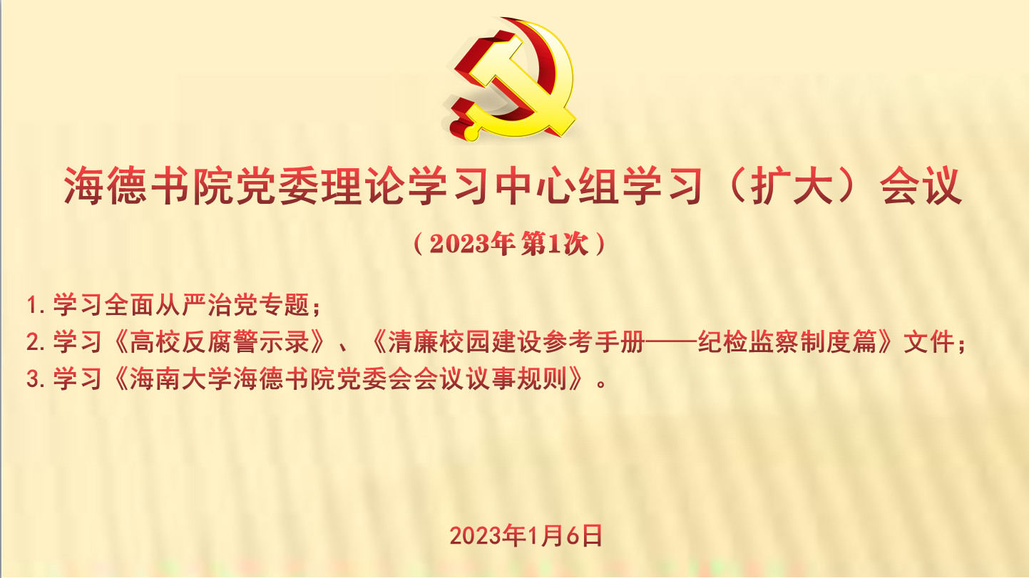 2023年是全面贯彻党的二十大精神的开局之年。会议要求,书院领导班子成员和党员干部带头做表率,认真深入学习宣传贯彻党的二十大精神,进一步学习贯彻落实习近平总书记“4·13”重要讲话,中央12号文件精神和习近平总书记关于海南工作的系列重要讲话精神,进一步深刻领悟“两个确立”的决定性意义,增强“四个意识”、坚定“四个自信”、做到“两个维护”,认真执行学校和书院的文件精神,认真落实学校和书院部署的各项任务,带领全院师生更加紧密地团结在以习近平同志为核心的党中央周围,始终牢记全面从严治党永远在路上,党的自我革命永远在路上,坚定不移全面从严治党,为书院高质量发展提供坚强政治保障。