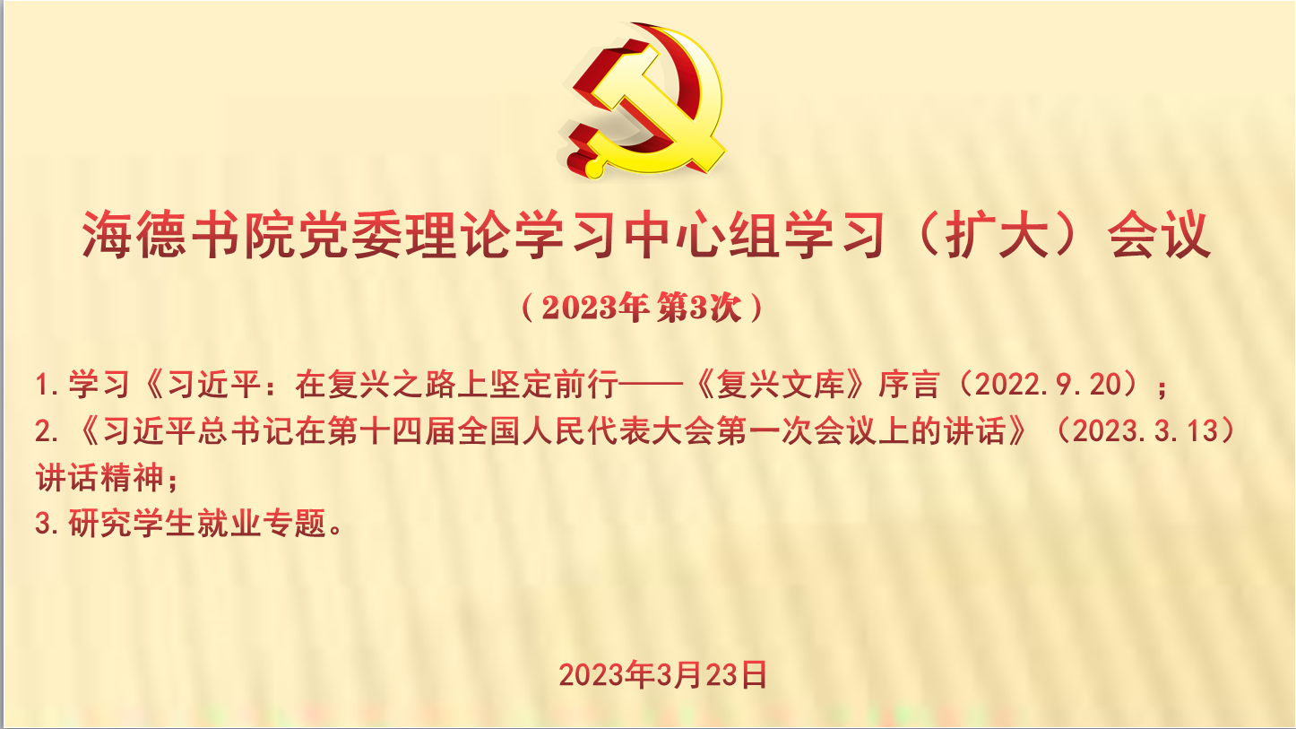 2023年3月23日,yl88858永利集团党委理论学习中心组召开本年度第3次中心组学习(扩大)会议。韩胜丁书记主持会议,党委理论学习中心组成员参加,组织员列席会议。会议学习内容主要包括:学习《习近平:在复兴之路上坚定前行——《复兴文库》序言》(2022.9.20)和《习近平总书记在第十四届全国人民代表大会第一次会议上的讲话》(2023.3.13)讲话精神。