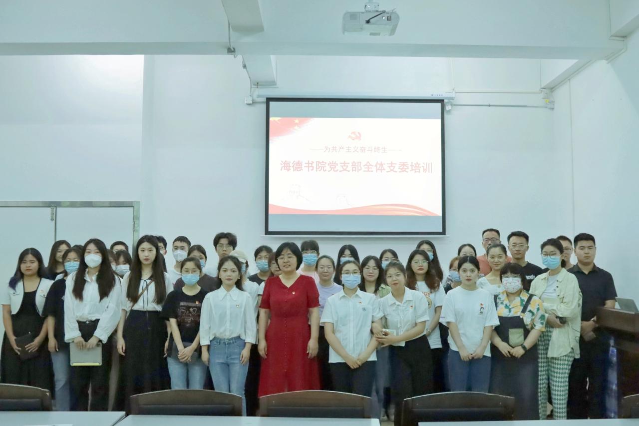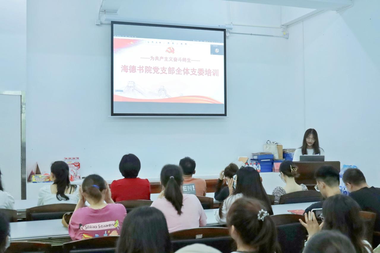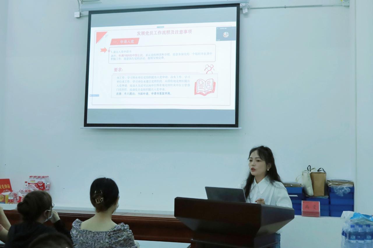 宣誓结束后,书院学生党建中心培训部的杨艺同志给大家开展培训工作。她十分清晰地讲解了发展党员工作流程、入党介绍人与培养联系人的任务区别、党龄的计算、党龄与党籍的区别、如何处理未满18岁申请入党和发展入党问题以及相关注意事项,并严谨详细的说明了入党的5个阶段和25个流程,后面还给大家讲解了如何规范化的填写党员材料等内容,并举例说明。最后,给大家分享了《海南大学党员发展规范化材料汇编》内容。