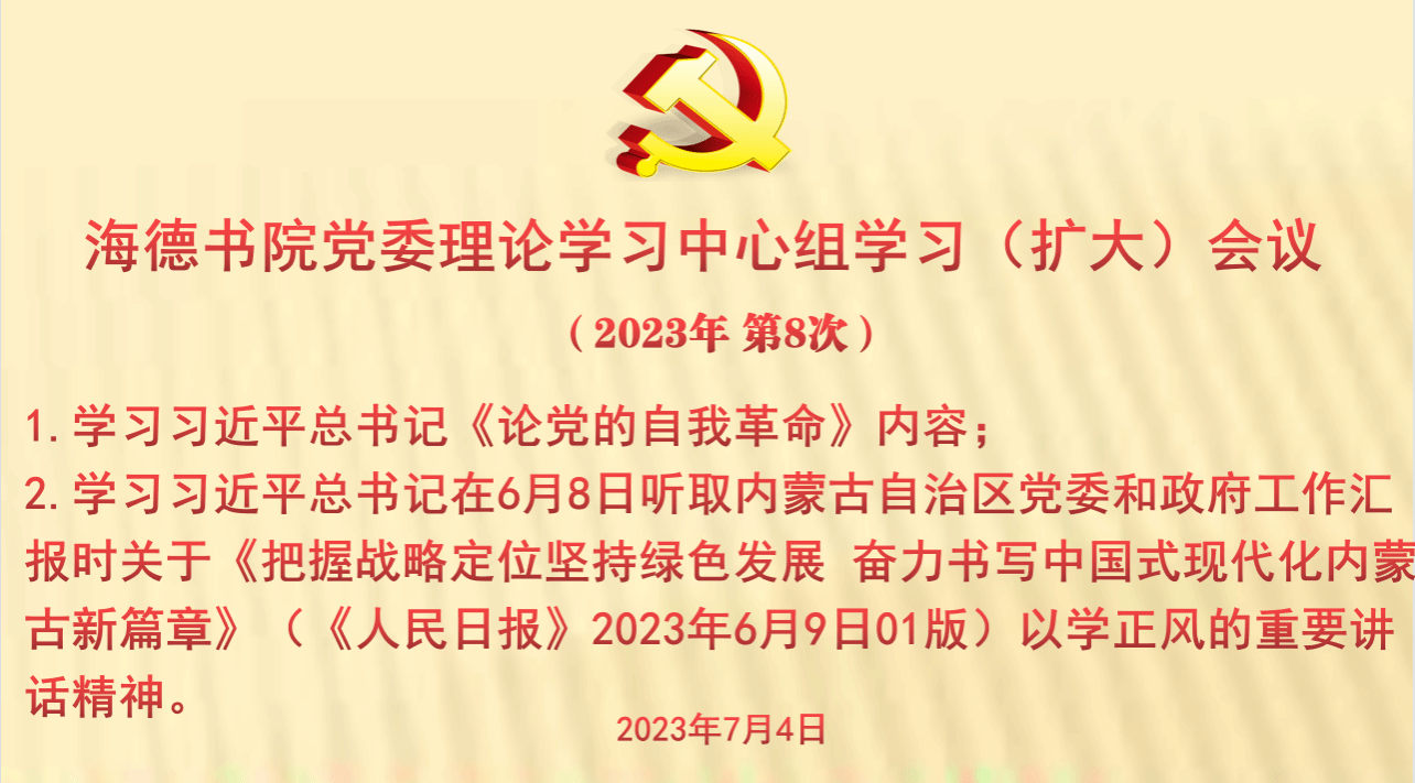 2023年7月4日,韩胜丁书记在17号楼103会议室主持召开了yl88858永利集团2023年第8次党委理论学习中心组学习(扩大)会议,重点学习习近平总书记《论党的自我革命》和学习贯彻习近平总书记在内蒙古考察时关于以学正风的重要讲话精神。书院党委委员和辅导员参加学习。