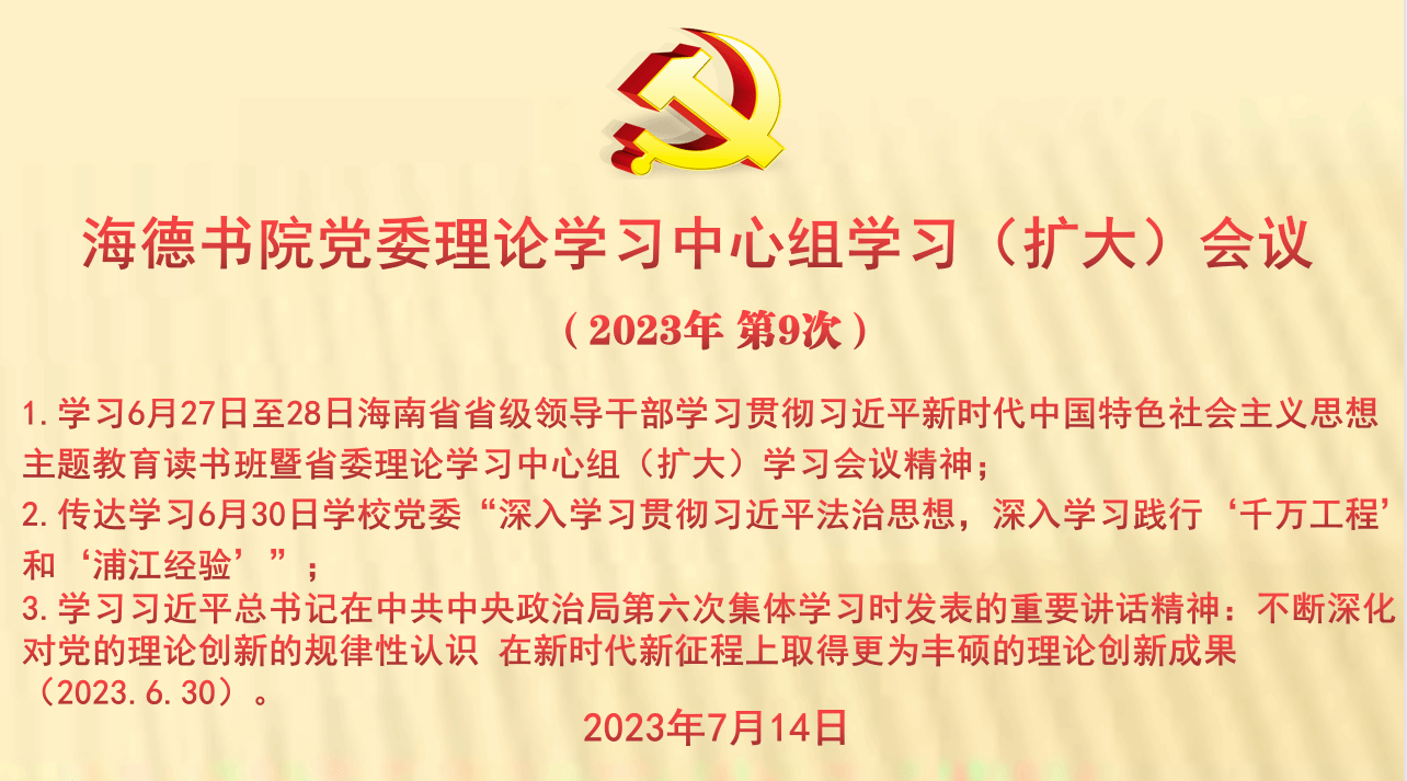 2023年7月14日,韩胜丁书记主持召开了yl88858永利集团2023年第9次党委理论学习中心组学习(扩大)会议,重点学习6月27日至28日海南省省级领导干部学习贯彻习近平新时代中国特色社会主义思想主题教育读书班暨省委理论学习中心组(扩大)学习会议精神;传达学习6月30日学校党委“深入学习贯彻习近平法治思想,深入学习践行‘千万工程’和‘浦江经验’,全力推进学校“双一流”高质量建设”理论学习中心组学习会议精神;学习习近平总书记在中共中央政治局第六次集体学习时发表的重要讲话精神:不断深化对党的理论创新的规律性认识 在新时代新征程上取得更为丰硕的理论创新成果(2023.6.30)。书院党委委员和辅导员参加学习。学习会议包括3个阶段。