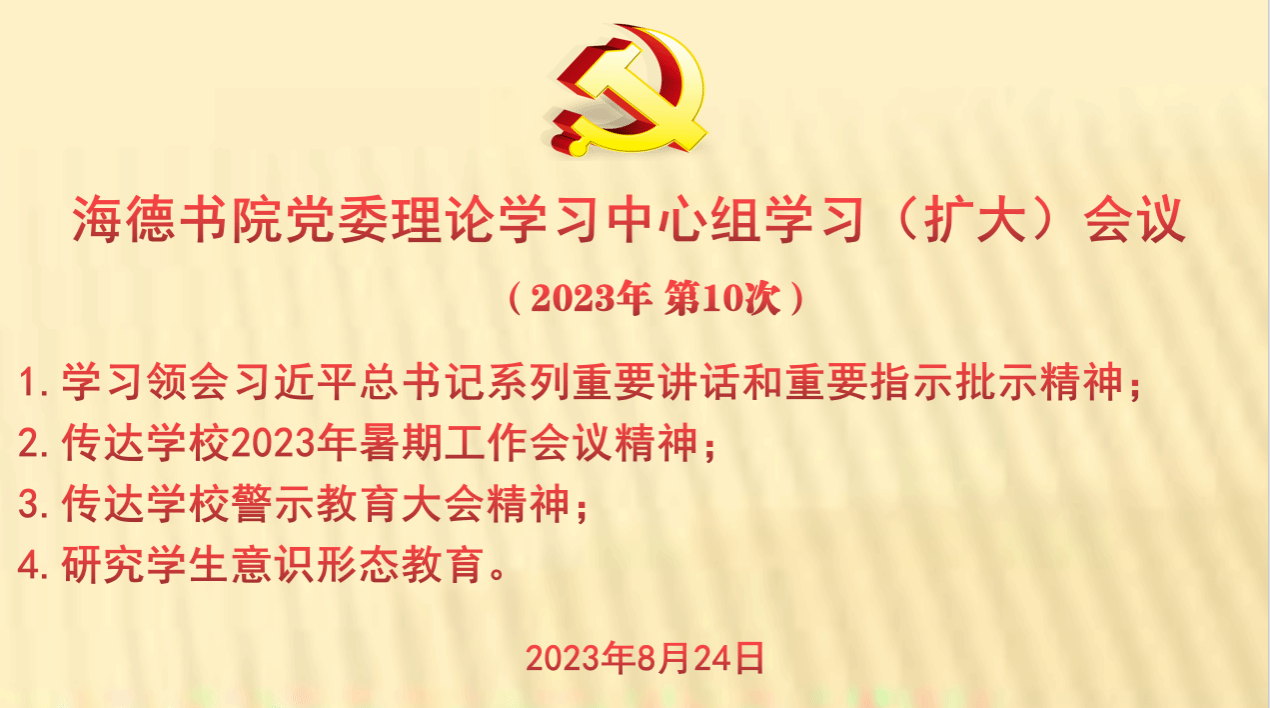 本次学习内容包括:认真学习领会习近平总书记关于党的建设的重要思想,学习习近平总书记关于严肃党内政治生活的重要讲话和重要指示批示精神,学习习近平总书记关于以学铸魂、以学增智、以学正风、以学促干等重要论述,学习领会习近平总书记关于树立和践行正确政绩观的重要论述,学习习近平总书记关于教育强国建设的重要论述,学习习近平总书记关于海南工作的系列重要讲话和重要指示批示精神,学习党章、新形势下党内政治生活若干准则、县以上党和国家机关党员领导干部民主生活会若干规定等党内法规;传达学校2023年暑期工作会议精神;传达学校警示教育大会精神;研究学生意识形态教育。书院党委委员和辅导员参加学习。学习会议包括四个阶段。