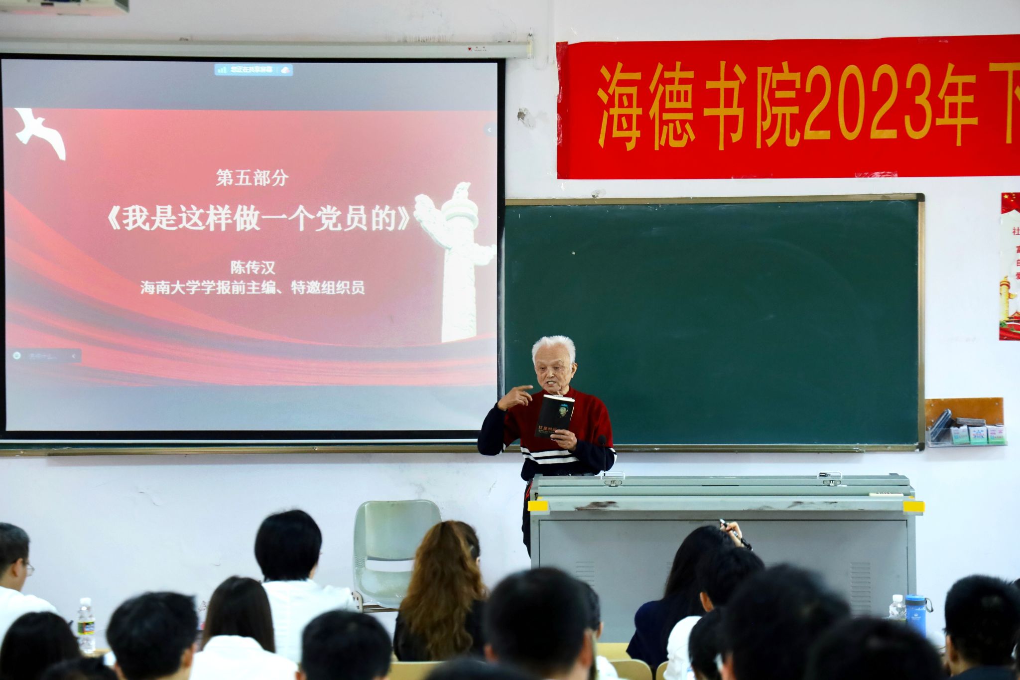 陈传汉老师对大家提出了号召,希望大家多去读伟人的文章、多读一些党史理论书籍,学习党的历史决议,深入学习认真体会来提高自己的思想觉悟,用理论来武装自己的头脑。