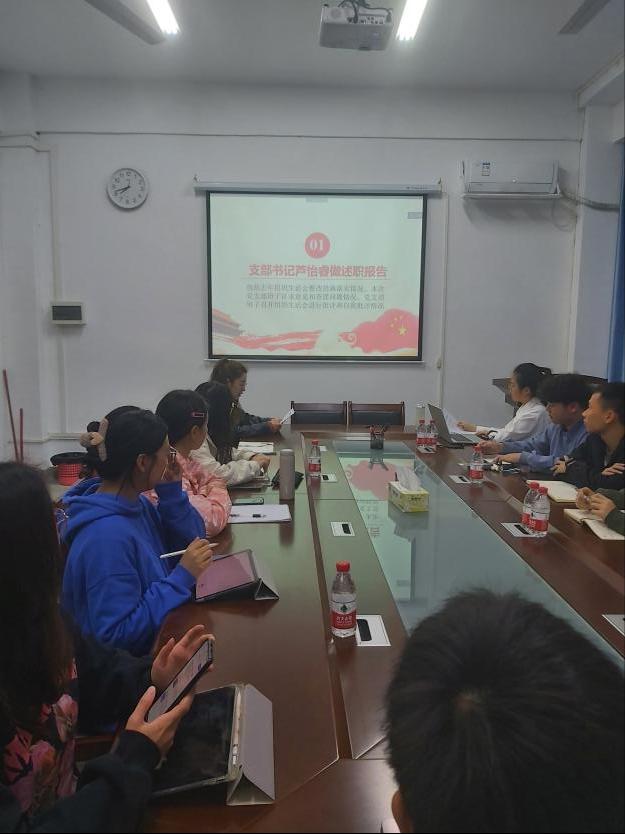李燕芳同志先简要介绍了会议流程,然后支部书记芦怡睿、副书记李燕芳、纪检委员张莹心、宣传委员王鹏潇、组织委员叶琴向全体党员做了述职报告,回顾了支部在2022年的工作进展,讲述了支部这一年的基本情况变化,包括党员、入党积极分子人数的变化。