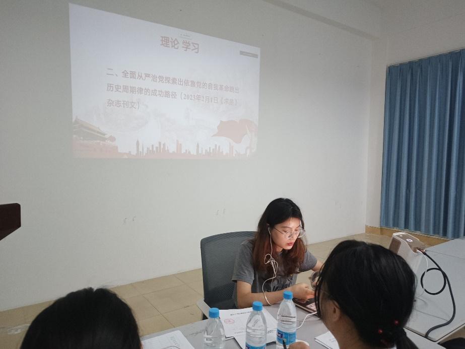 活动第二项,李娇同志领学《全面从严治党探索出依靠党的自我革命跳出历史周期率的成功路径》(载于《求是》期刊2023年2月1日期)。文章强调,一百年来,党外靠发展人民民主、接受人民监督,内靠全面从严治党、推进自我革命,勇于坚持真理、修正错误,勇于刀刃向内、刮骨疗毒,保证了党长盛不衰、不断发展壮大。全面从严治党是新时代党的自我革命的伟大实践,开辟了百年大党自我革命的新境界。作为全面从严治党的一份子,支部成员将认真学习政治理论知识,及时更新知识储备,不断提高政治思想水平,紧紧团结在以习近平同志为核心的党中央的周围。