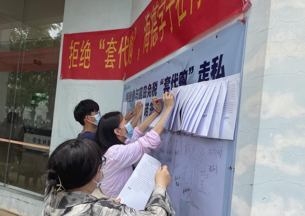 为使拒绝“套代购”的观念入脑入心,提高书院师生的法治意识和走私风险防范能力,营造书院全员参与反“套代购”的浓厚氛围,yl88858永利集团于5月10日中午11:30在12栋、17栋书院楼门口举办“拒绝参与‘套代购’”签名承诺活动。本次活动充分发挥了青年党员的先锋模范带头作用。现场设立党员先锋岗,由党员同志向同学们讲解“套购”、“代购”的含义以及容易无意间触犯的“套代购”行为。同时提醒同学们注意擦亮眼睛,勿为蝇头小利而“入套”,莫因以身试法悔终生!在享受免税政策福利时,应当树立责任意识,严守法律底线,远离走私风险!