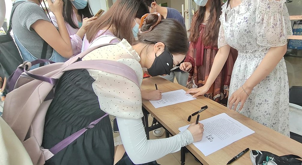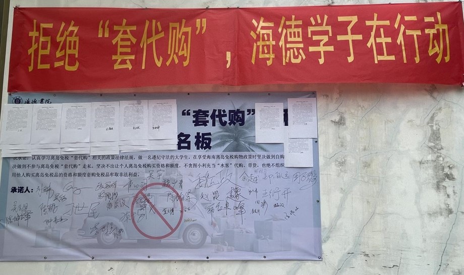 海德师生们郑重签下拒绝参与离岛免税“套代购”走私承诺书,并张贴在签名墙上。