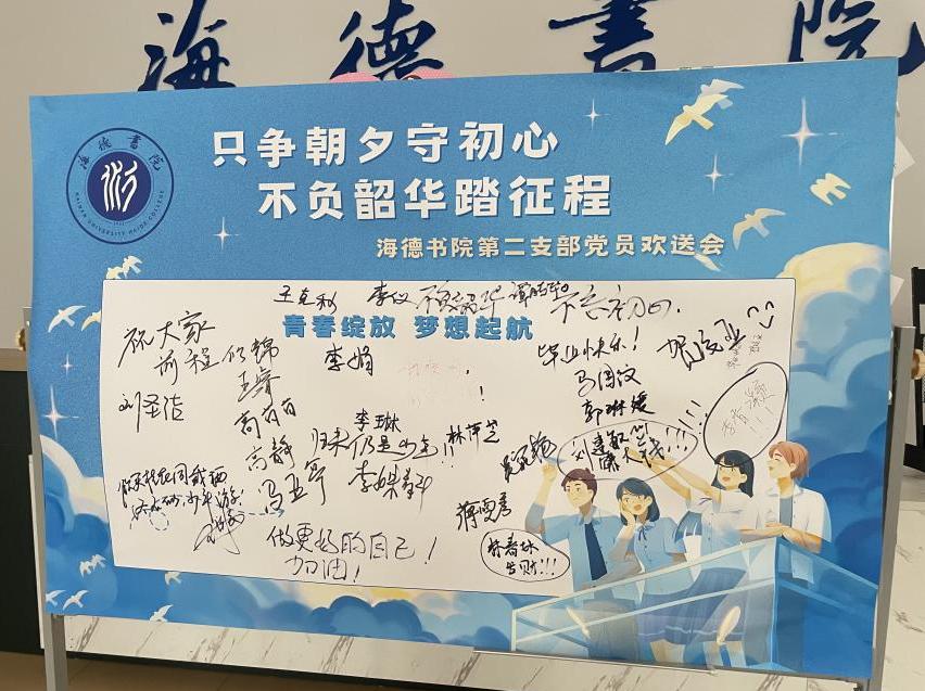 党支部为每位毕业党员送上带有海南大学纪念印章的明信片,以此寄情寄语,为每位毕业生党员送上最真挚的祝福。同时,欢送会准备“祝福签字版”,每位毕业党员在签字板上签下自己的姓名和祝福语。