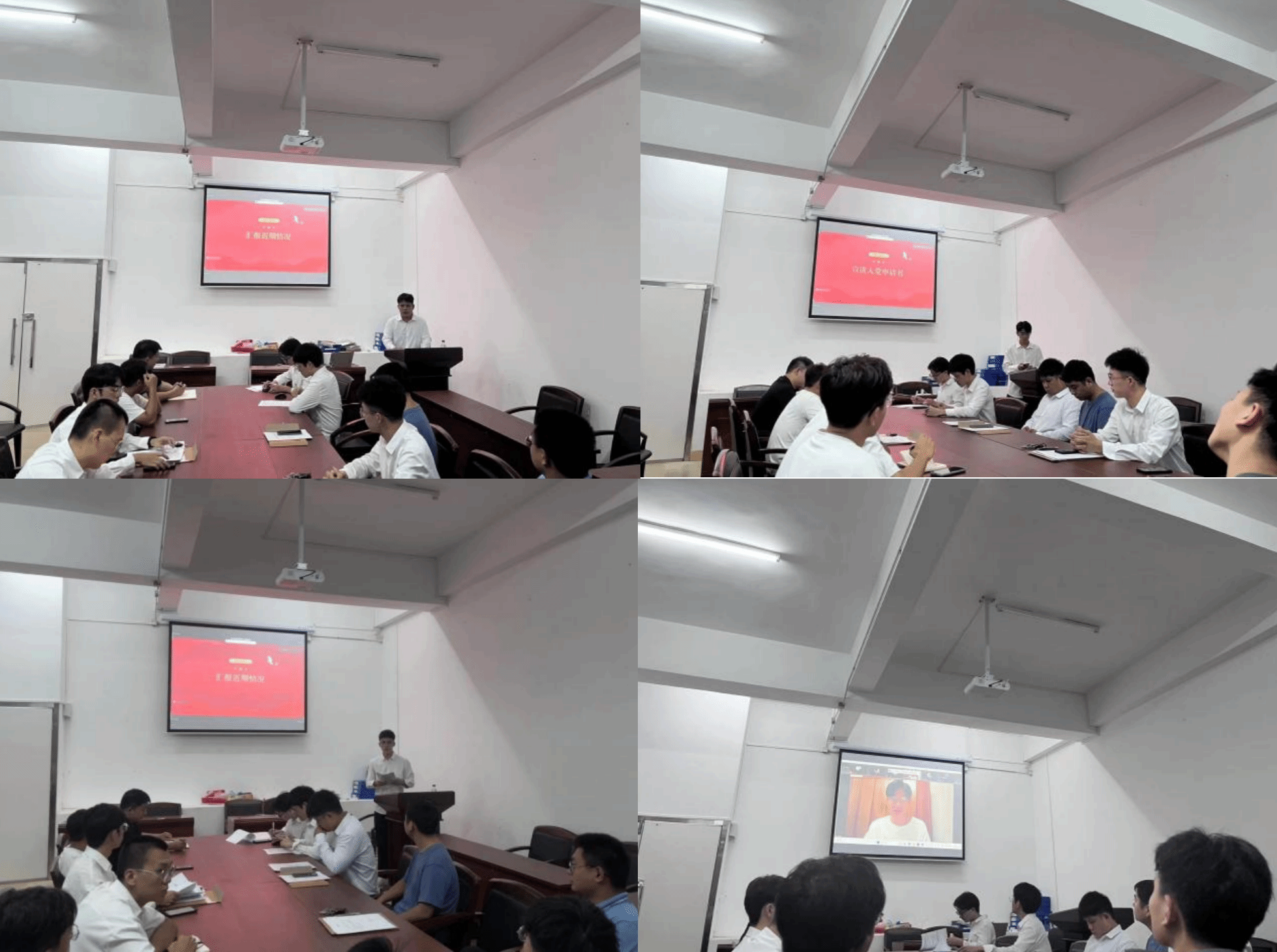 会议共五项议程,由拟接收的4名发展对象依次宣读入党申请书;汇报近期情况:对党的认识、入党动机、本人履历、家庭和主要社会关系情况,以及需向党组织说明的问题;党员针对疑问进行提问以及理论知识、时政提问;各位发展对象的入党介绍人、支部委员会依次发表意见;支部正式党员就发展对象能否入党进行了充分讨论,由正式党员进行无记名投票。