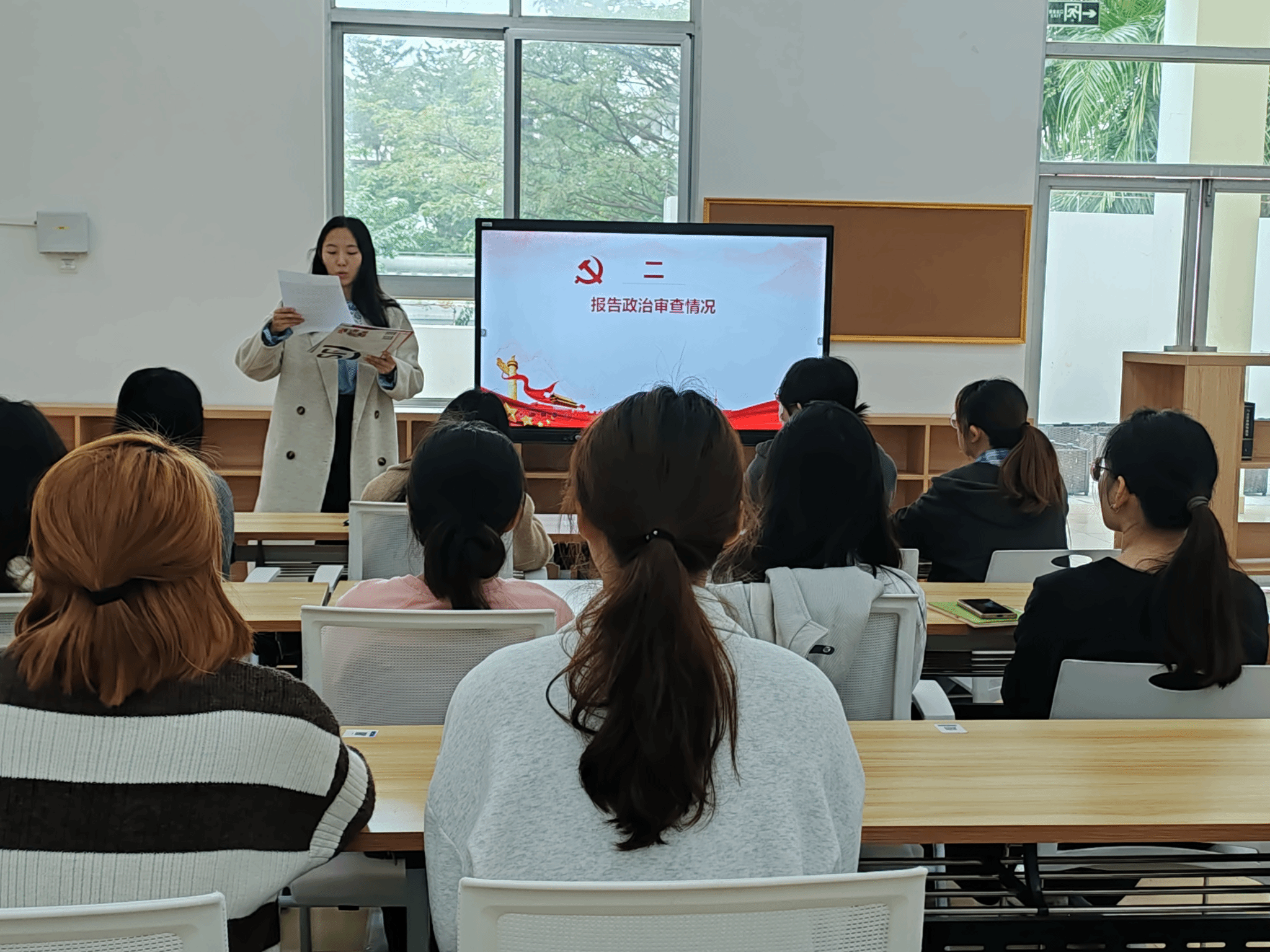 支委于晓涵同志向大会报告政治审查情况,与会党员本着客观公正、认真负责的态度,对发展对象是否符合党员条件发表了意见。大会认为,崔世娇、张庆粉、李禛与张卓4名同志基本符合党员条件,经与会正式党员投票表决,大会一致同意接收该4名同志成为中共预备党员。