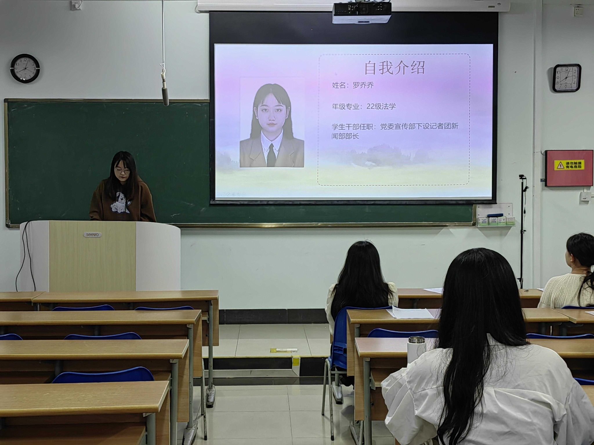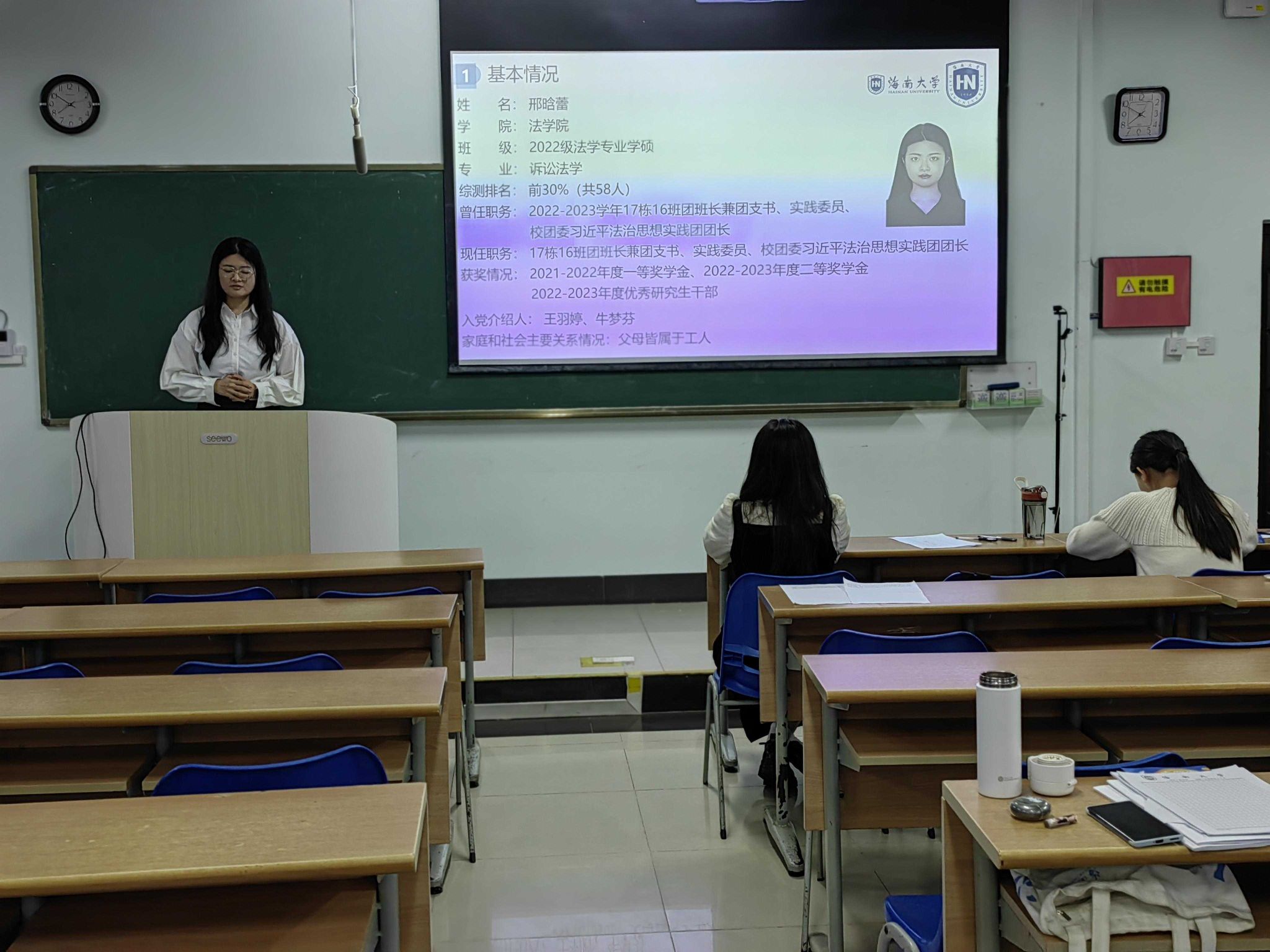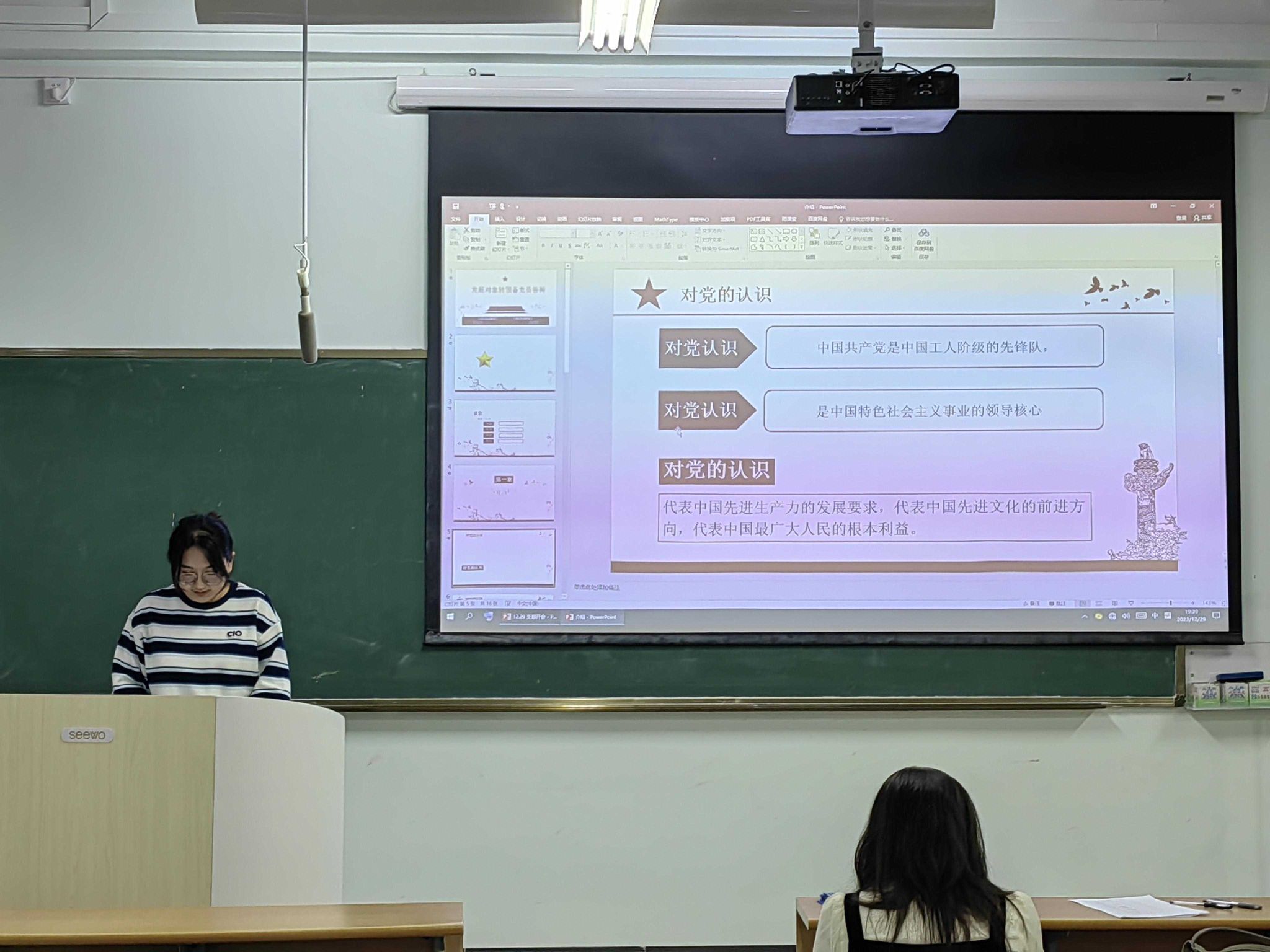 预备党员接收大会伊始,由发展对象进行情况汇报并由入党介绍人发表意见,邢晗蕾等六名发展对象汇报自己在思想、工作、生活、学习等方面的情况,汇报完毕之后由两位入党介绍人就该同志的思想等方面的表现,发表是否同意其入党的意见。邢晗蕾等六名同学的入党介绍人均同意其成为预备党员。
