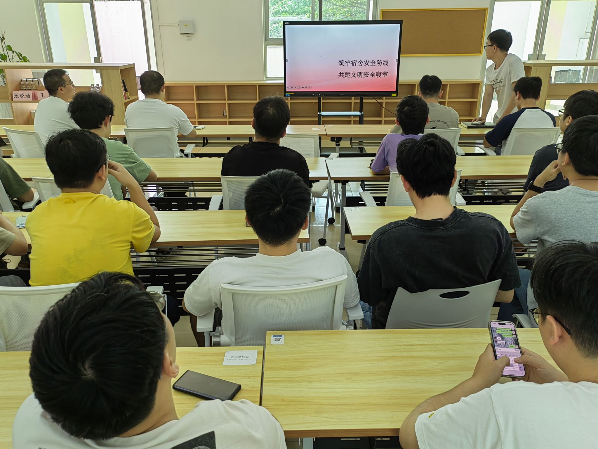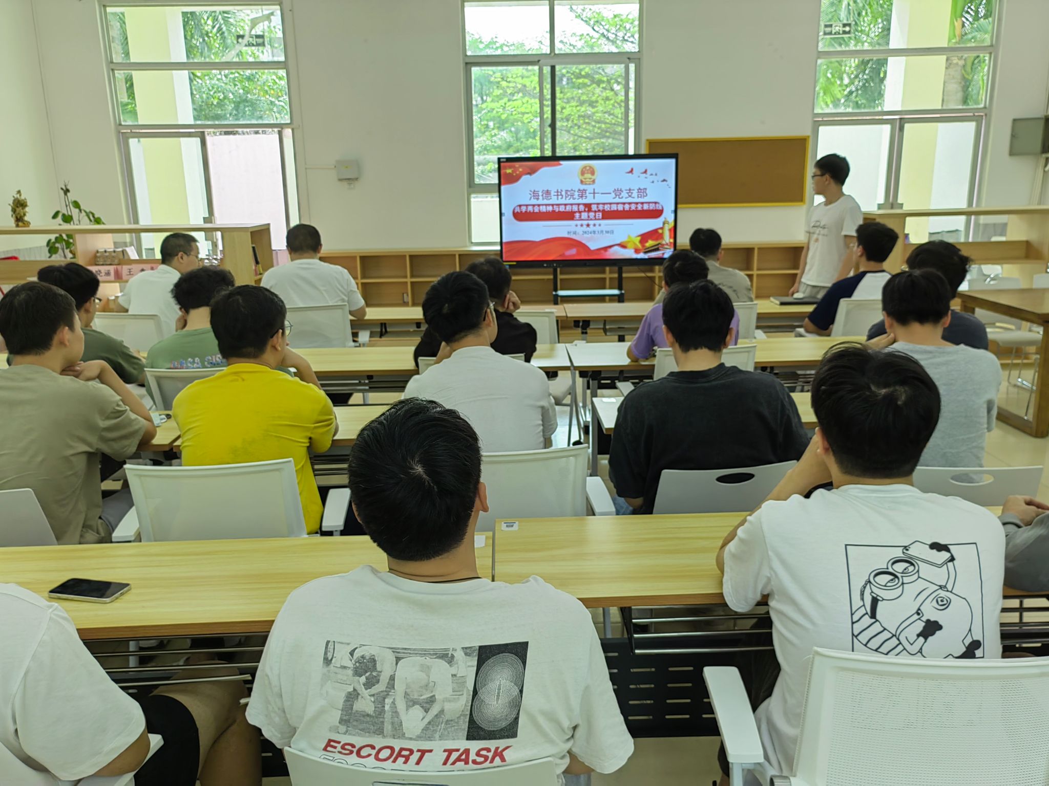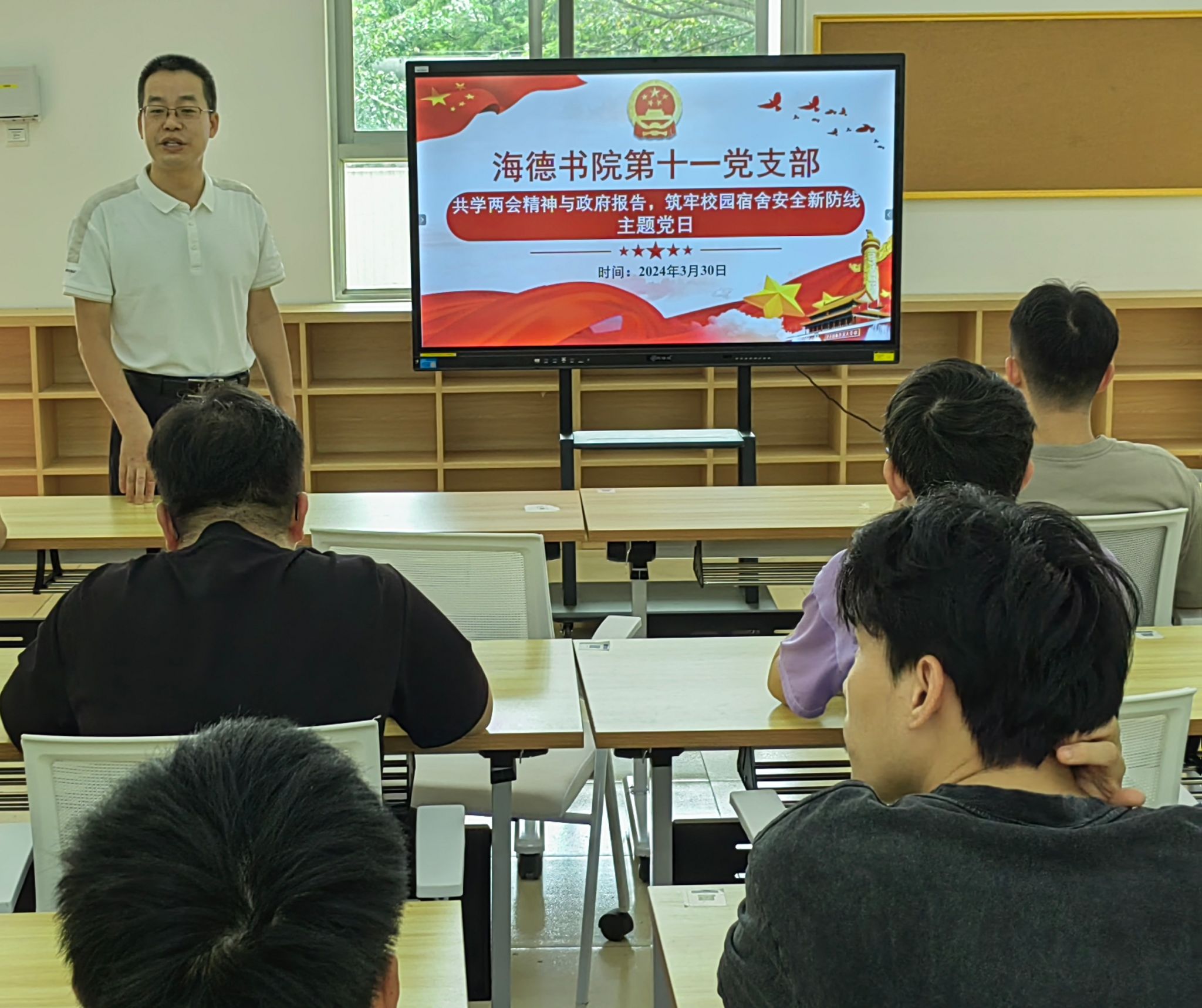 梁小龙同志简要介绍会议流程,并带领大家学习了全国两会精神、2024年政府工作报告和校园宿舍安全的相关内容。