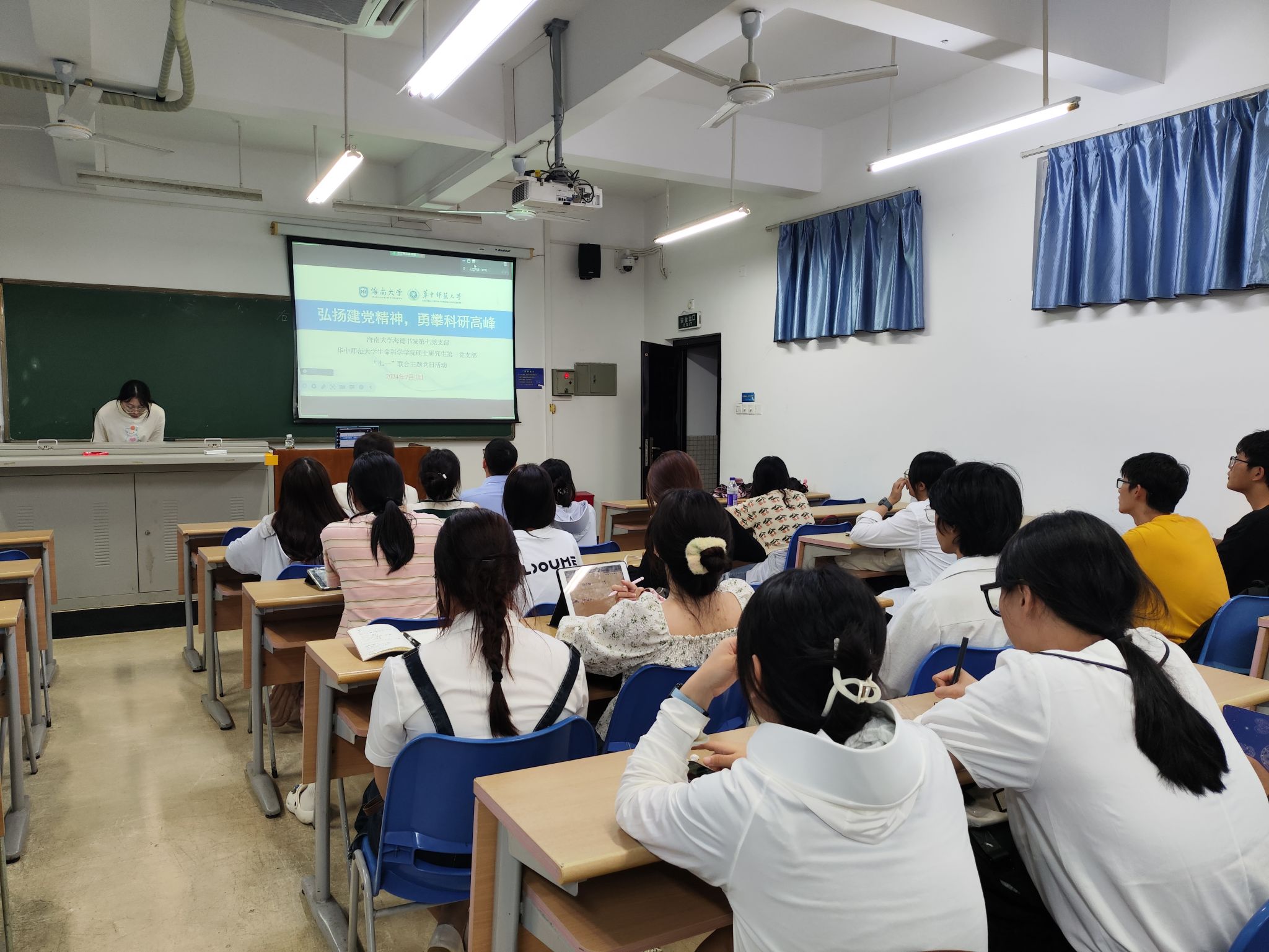 华中师范大学生命科学学院党委副书记姚珂、辅导员刘琴,海南大学yl88858永利集团副处级辅导员崔建兵出席活动,华中师范大学生命科学学院李睿教授应邀作主题党课,海南大学生命科学学院教师洪玥教授应邀作学术报告,两个支部全体党员、积极分子约80人参加活动。